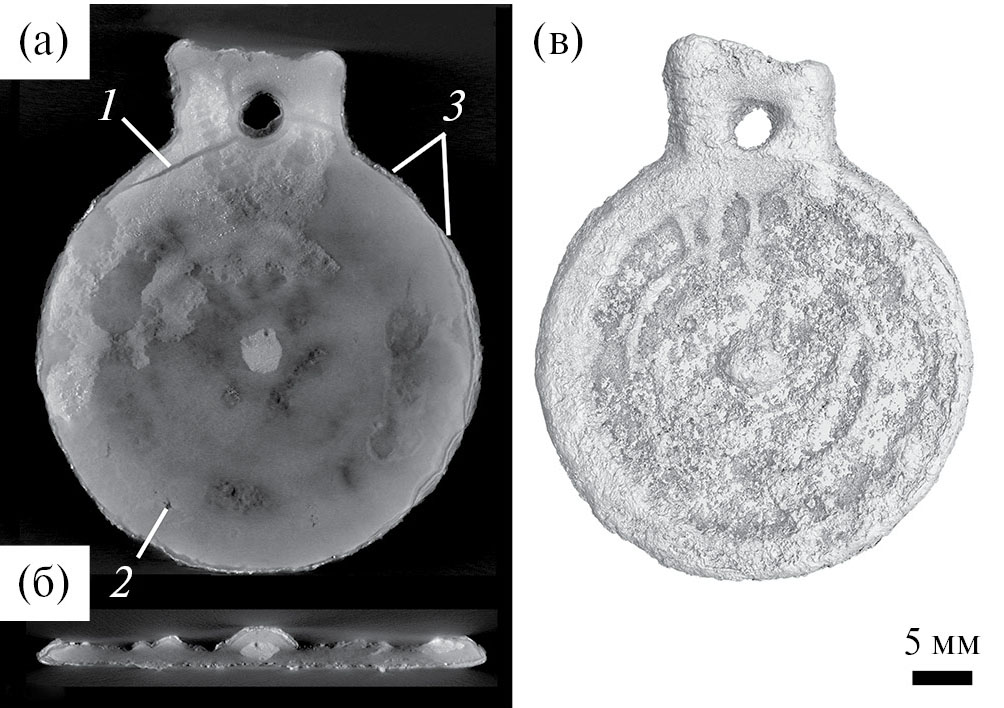 По данным РТ фрагмент зеркала З-1 имеет хорошую сохранность. Толщина зеркала – от 0.4 до 1.5 мм, в зоне петли – от 1.6 до 2.8 мм. На поверхности зеркала идентифицируется слой коррозии толщиной 0.2–3 мм (рис. 2а, 1). В материале изделия наблюдаются множественные включения до 0.4 мм, сильно поглощающие рентгеновское излучение, размеры и количество которых максимальны в области петли (рис. 2а–2г, 2). В толще диска регистрируются сферические пустоты диаметром до ~0.5 мм (рис. 2а, 3), характерные для метода отливки. Методом РТ уточнены детали рельефного орнамента, слабо выраженного на этом изделии (рис. 2д). По сохранившемуся фрагменту зеркала с помощью программного пакета VGS оценены внешний диаметр диска, который составил ~50 мм (без учета петли), и размеры орнамента. На поверхности зеркала выявлены три концентрические окружности, диаметры которых по результатам моделирования – около 22, 26 и 38 мм. Пространство между внешней и средней окружностями заполнено радиально расходящимися лучами. Во внутренней окружности орнамент слабо выражен, идентифицировать его невозможно.
