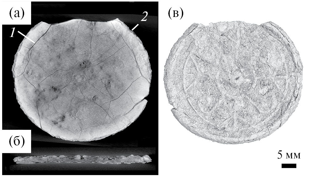 Анализ данных РТ зеркал З-2 и З-3 показал, что образцы подверглись значительной коррозии (рис. 3а, 3б, 3; 4а, 4б, 2). В области петли у зеркала З-2 проходят несколько сквозных трещин (рис. 3а, 1). По данным РТ толщина зеркала – от 1.5 до 3.3 мм (в центре) с утолщением в области петли 4.7 мм. В материале металла обнаружены пустоты неправильной формы до 0.9 мм (рис. 3а, 2). Зеркало З-2 обладает наиболее высоким и детализированным рельефом, визуальная интерпретация которого осложнена ввиду коррозии (рис. 3а, 3б, 3). На поверхности зеркала на расстоянии ~10 и 15 мм от центра проходят две концентрические окружности, между которыми располагаются радиально расходящиеся лучи (рис. 3в).