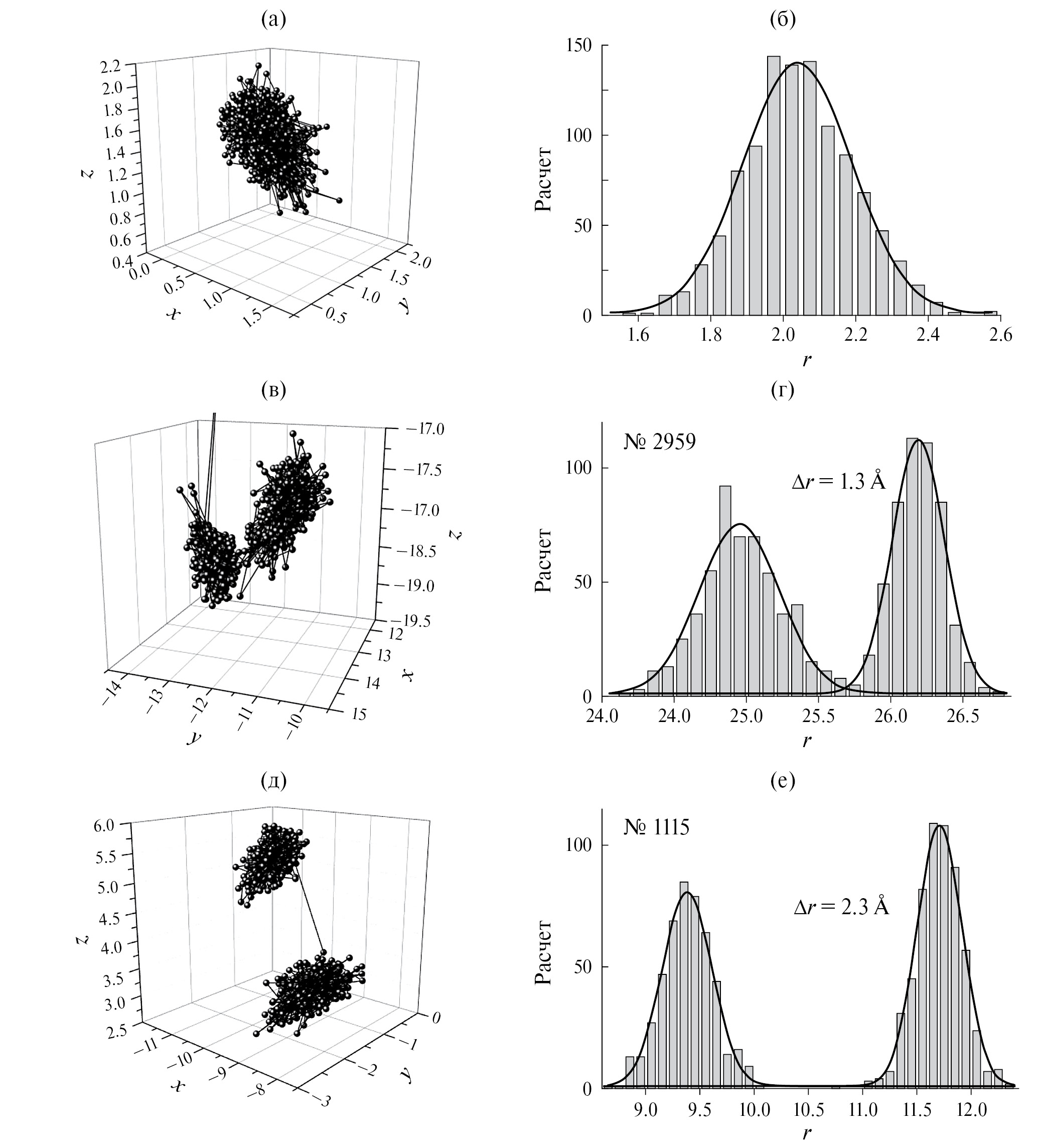 Микроскопика ионного переноса. Для визуального отображения особенностей анионного переноса были проанализированы траектории движения кислорода в образцах различной дефектности. Во всех дефектных кристаллах большая часть ионов кислорода совершает колебательные движения в окрестностях их кристаллографических позиций (рис. 3а, 4а), причем амплитуда тепловых колебаний, найденная из анализа гистограмм положений атомов (рис. 3б, 4б), составляет 0.7–0.8 Å, что неплохо согласуется с данными, полученным из анализа среднеквадратичных смещений: 0.65–0.75 Å.