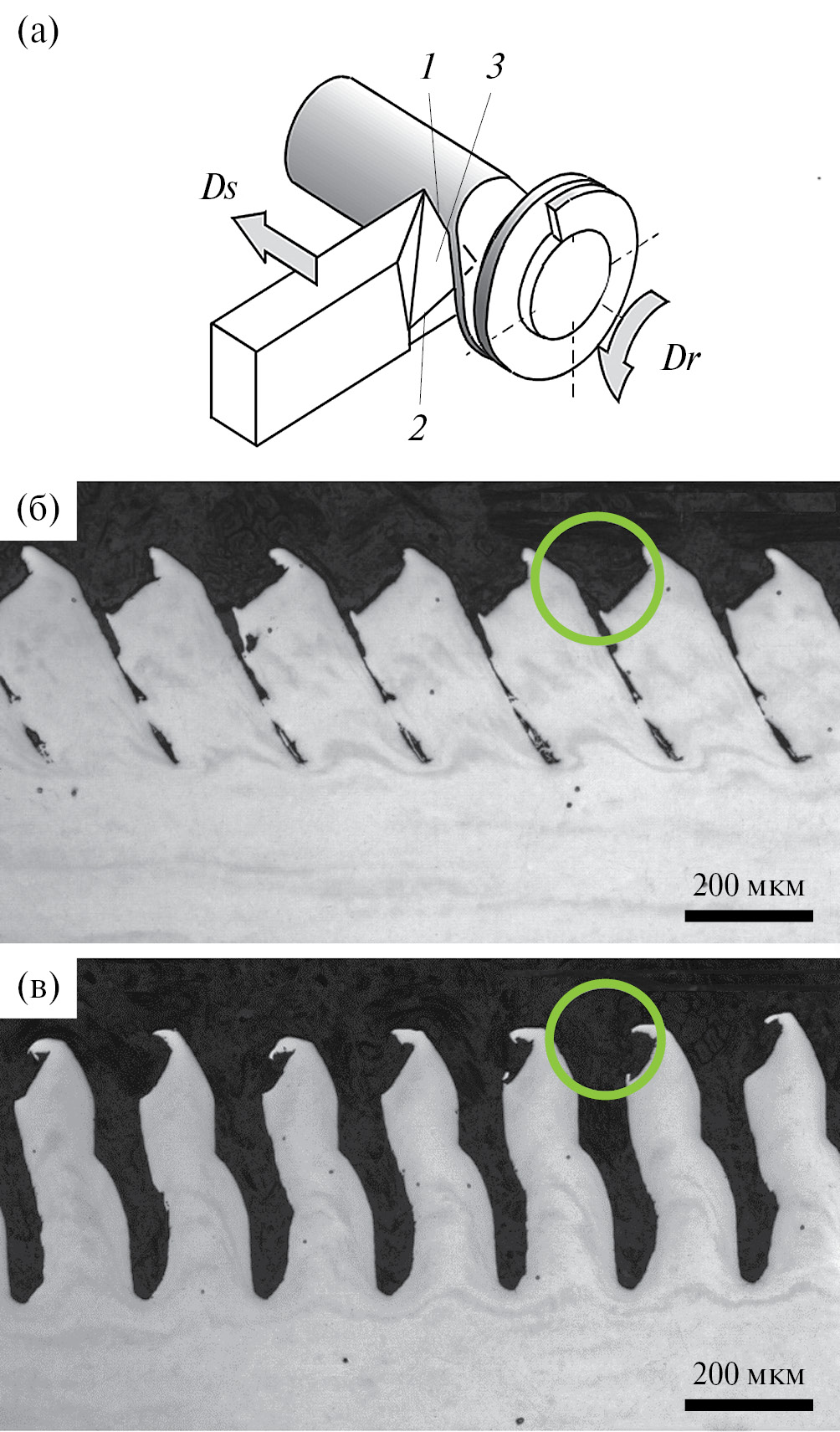 Рис. 1. Схема деформирующего резания (а) и микроструктура поперечного сечения оребрения на стали 08Х18Н10Т после деформирующего резания по режимам ДР-1 (б) и ДР-2 (в): 1 – главная режущая кромка, 2 – вспомогательная (деформирующая) кромка, 3 – передняя поверхность, Dr – главное движение резания, Ds – движение подачи, кругом отмечена область, исследуемая рентгеновским методом.