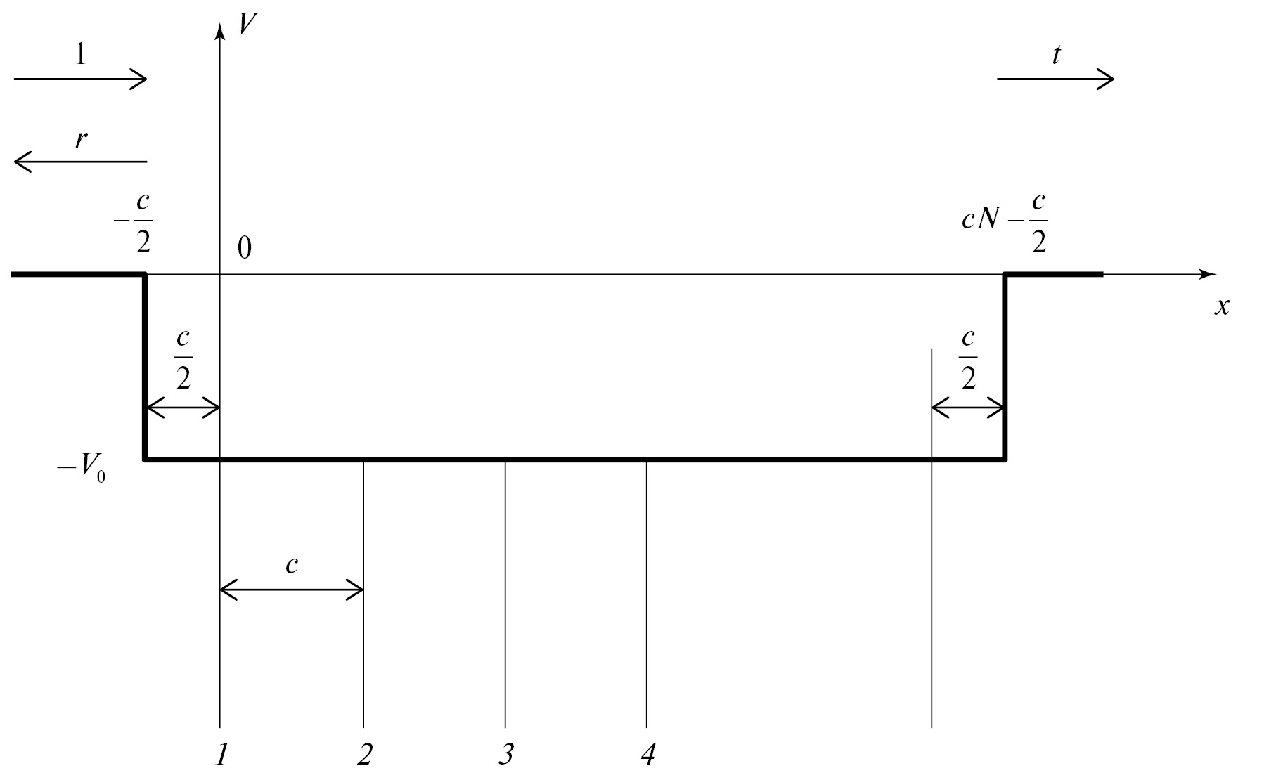 Здесь с – период одномерной решетки, N – число периодов в ней, т.е. количество плоскостей в пленке, параллельных ее поверхности, – высота потенциальной ступеньки на границах пленки, δ(x) – дельта-функция Дирака, U = 2πy/c2 – “мощность” потенциала δ-функции, y – безразмерный параметр модели, ħ – постоянная Планка, m – масса электрона, x – координата по оси, перпендикулярной поверхности пленки.