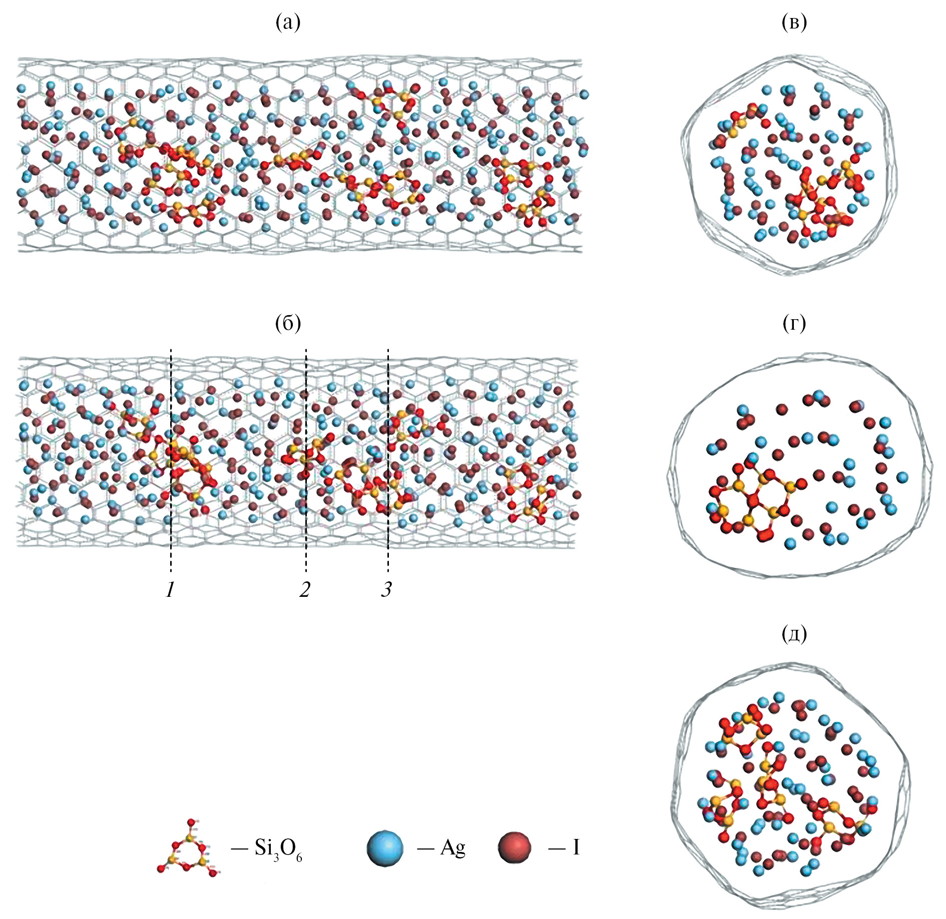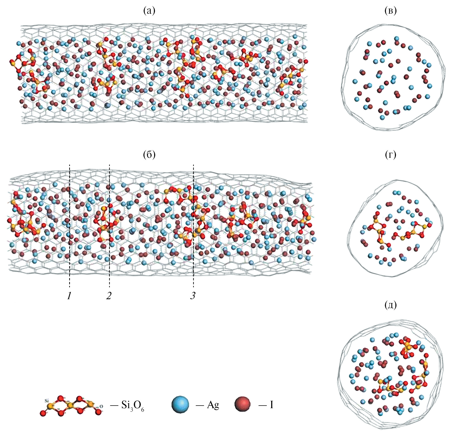 Как видно из рис. 2а, 2б и 3а, 3б, в результате расчетов происходят небольшая деформация трубок и существенное перераспределение атомов Ag и I, в то время как нанокластеры оксида кремния испытывают лишь небольшие искажения и смещения. Кроме того, из этих рисунков следует, что, несмотря на задаваемое случайное распределение по объему частиц Si3O6 при заполнении трубок, в них наблюдаются “пустые” и “ уплотненные” области с агломератами наночастиц. Анализ распределения частиц оксида кремния в поперечных сечениях различного типа областей (рис. 2, 3в–3д) позволяет считать, что даже в уплотненных местах остается достаточно свободного пространства для возможного транспорта ионов Ag и I.