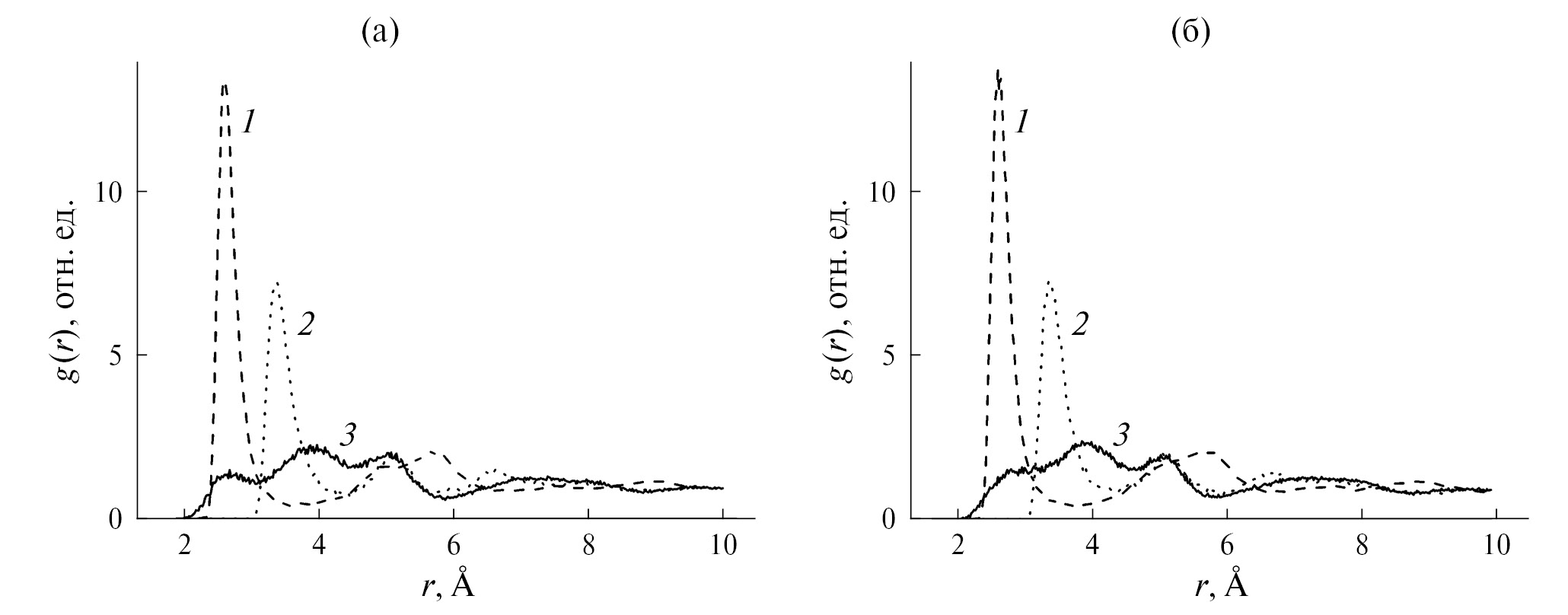 Для анализа структурных особенностей моделируемой системы строили радиальные парные корреляционные функции (РПКФ)