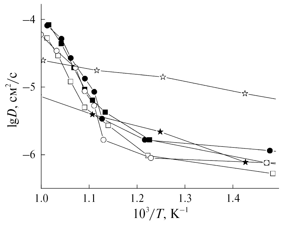 Рис. 6. Диффузия ионов серебра и иода в трубках: ∎ – Ag в ОСУНТ c линейным кластером Si3O6, □ – I в ОСУНТ c линейным кластером Si3O6, ● – Ag в ОСУНТ c планарным кластером Si3O6, ○ – I в ОСУНТ c линейным кластером Si3O6, ☆ – Ag в ОСУНТ (11,11) [31], ★ – I в ОСУНТ (11,11) [31].