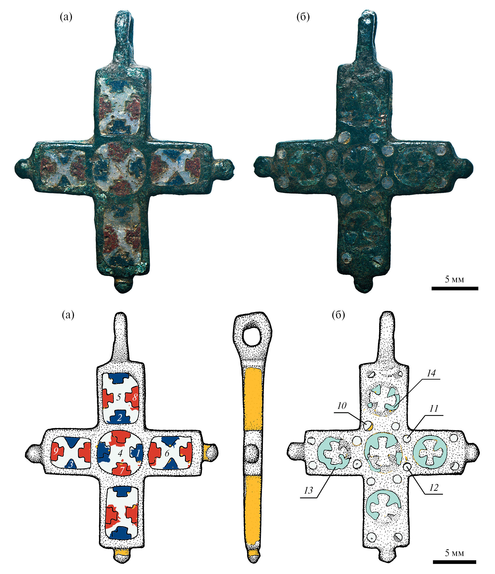 Рис. 2. Крест из Владимира: а – лицевая сторона, б – оборотная сторона. Фото Е.С. Коваленко, Е.К. Столяровой. Рисунок А.С. Дементьевой. Цифрами обозначены зоны анализа.