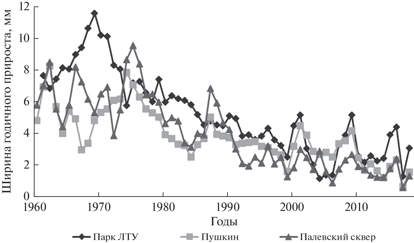 Исследовалось влияние температуры и осадков на изменение радиального прироста древесины тополя берлинского (Populus × berolinensis Dipp.) и липы мелколистной (Tilia cordata Mill.) в Санкт-Петербурге. Керны отобраны со старых деревьев в парке Лесотехнического университета, в Палевском сквере, в г. Пушкине (тополь) и в Московском парке Победы (липа). Для исключения влияния фактора возраста образца на изменение ширины его годичных колец были использованы общепринятые методы детрендинга, расчеты проводились в программном обеспечении Arstan. Колебания осадков и температуры зимнего периода значимо не влияют на рост тополя и липы в Санкт-Петербурге. Летние осадки оказывают положительное, но не определяющее воздействие, в некоторых случаях радиальный прирост древесины увеличивается с ростом количества осадков. Температура не оказывает значимого воздействия на стандартизированные (очищенные от влияния возраста) показатели прироста. Нестандартизированные средние значения прироста при увеличении температуры в июле–сентябре достоверно снижаются. Воздействие температуры и осадков, по-видимому, проявляется опосредованно, усугубляя или сглаживая воздействие других факторов, в особенности фактора загрязнения воздуха. Воздействие загрязняющих веществ усиливается при повышении температуры в конце вегетационного сезона, т.к. происходит их накопление на поверхности листьев. Осадки смывают загрязняющие вещества, снижая интенсивность влияния загрязнения. Снижение прироста во второй половине 1990-х гг. у тополя при отсутствии такового у липы объясняется последствиями продолжительной вспышки массового размножения тополёвой моли – пестрянки (Phyllonorycter populifoliella) в 1991–1999 гг. Высказанные предположения требуют дополнительных исследований, в частности определения уровня загрязнения листьев в течение вегетационного сезона и учета воздействия других факторов.