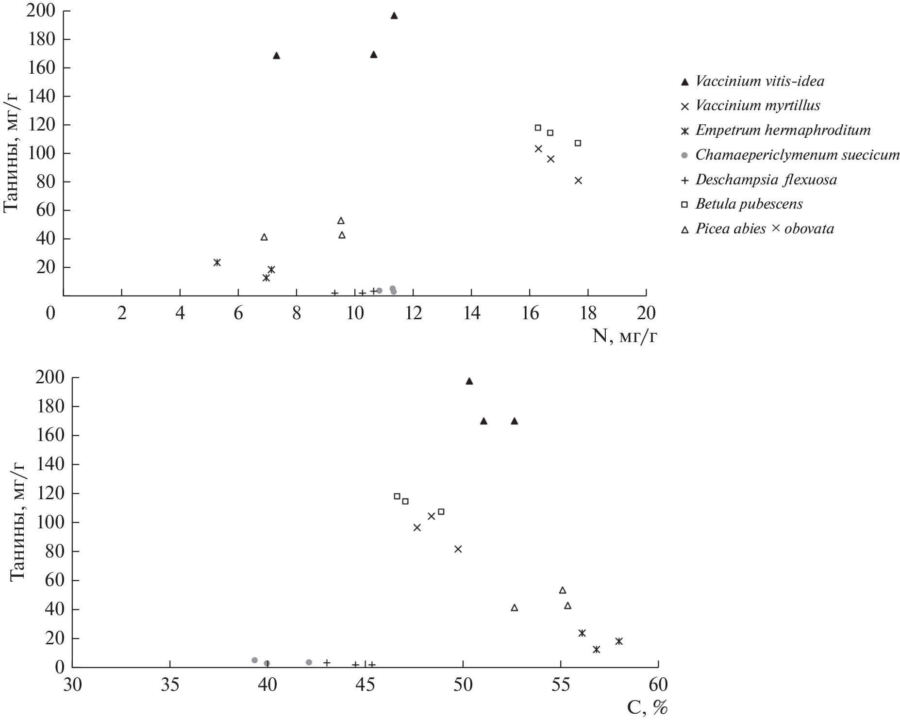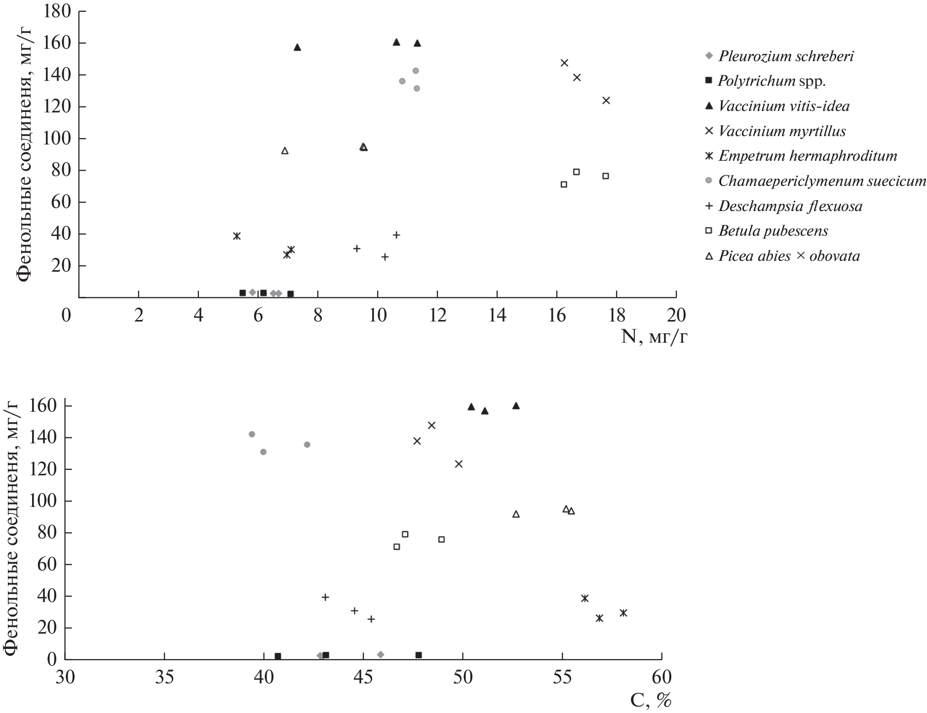 The study presents an analysis of aging (falling) organs (leaves/needles) of the following plants: Siberian spruce (Picea abies ssp. obovata (Ledeb.) Domin), downy birch (Betula pubescens Ehrh), common cowberry (Vaccinium vitis-idaea L.), crowberry hermaphroditic (Empetrum hermaphroditum Hager.), blueberry (Vaccinium myrtillus L.), Schreber’s pleurium (Pleurozium schreberi (Brid.) Mitt.), polytrichum (Polytrichum spp.), dwarf cornel (Chamaepericlymenum suecicum (L.) Aschers. & Graebn. (Cornus suecica L.)), wavy hair-grass (Deschampsia flexuosa (L.) Trin.). A significant variation in the chemical composition (the content of lignin, phenolic compounds, tannins, nitrogen and carbon, as well as the stoichiometric ratios “C/N”, “lignin/N”, “lignin/cellulose”) was found among plants of the northern taiga forests at the interspecific level. The influx of secondary metabolites with litter depends on the plant communities’ species composition and the contribution of various plant species to the vegetation cover’s composition. At the intraspecific level (for Siberian spruce growing in different landscape positions within empetro-piceetum forests (in automorphic, transit and accumulative landscapes)) an increase in the content of soluble tannins (p < 0.05) in spruce needles from the automorphic positions of landscape was determined. Also have been studied some interrelations between secondary metabolites, nitrogen and carbon in the composition of aging photosynthetic organs of dominant plant species in northern taiga empetro-piceetum forests.
