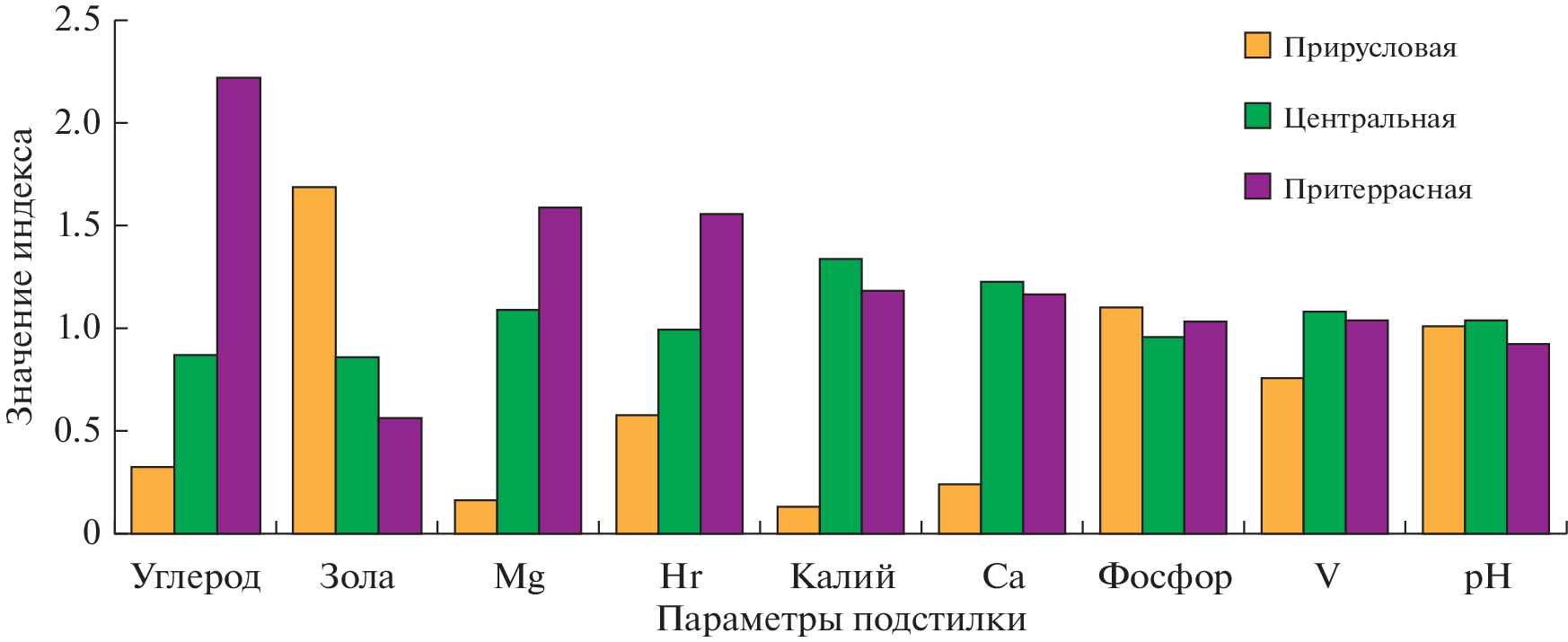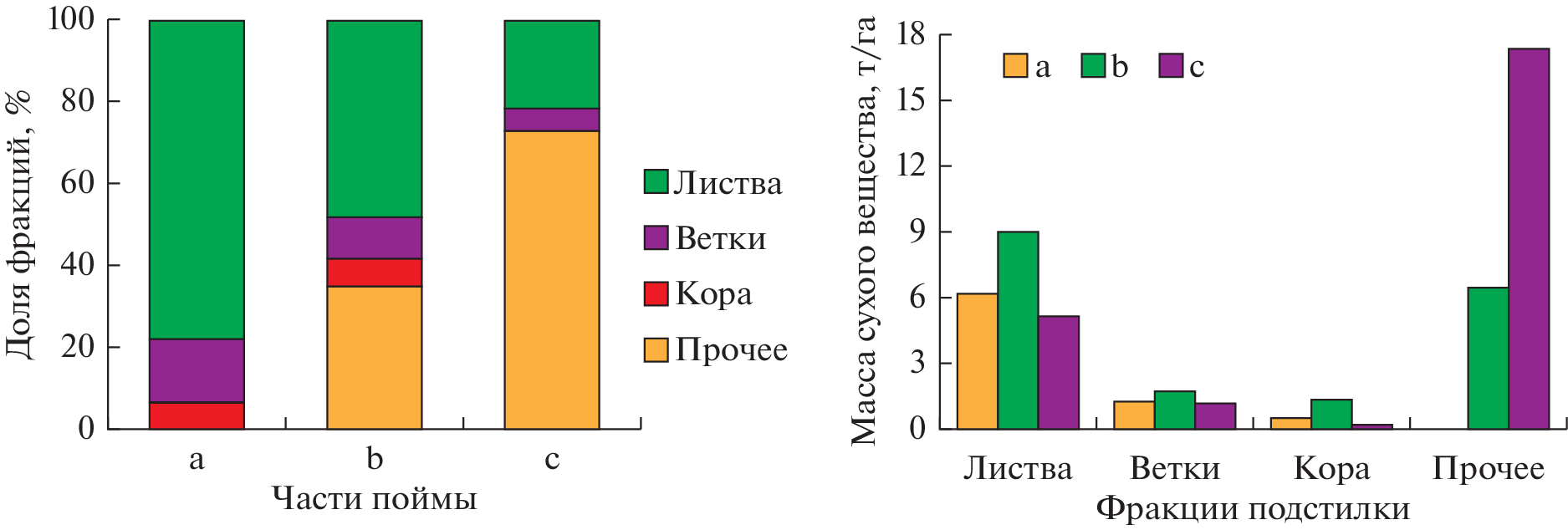 The studies, carried out in the floodplain ecotopes of the Bolshaya Kokshaga reserve (Russia, the Republic of Mari El) are relevant due to the need to understand the patterns of formation of the forest litter properties, which are a sensitive integral indicator of the biogeocenoses conditions. The work has been carried out on 20 test plots located in different parts of the floodplain in areas with a point bar type of river bed evolution, and, in addition to the main physicochemical parameters, the weight of the litter, its fractional composition and seasonal dynamics, as well as carbon reserves in it, were estimated. It was established that the weight of the litter on the studies sites decreased during the growing season from 20 to 33% of its value at the end of May. The main loss of its mass was observed in the first half of summer. The variability of the litter’s physicochemical parameters, especially its acidity, the degree of base saturation, the exchangeable calcium content, as well as the content of mobile phosphorus and potassium compounds, was found to be tied mainly to the features of the ecotopes, and their seasonal changes turned out to be statistically insignificant. It was determined that the greatest differences between the ecotopes were in the litter mass and the carbon stock in it. The mobile potassium and exchangeable calcium content were the highest in the litter of biotopes from the central part of the floodplain, and the content of ash and mobile phosphorus was the highest in the near-river zone. The ecotopes differed least of all in terms of the litter acidity and the degree of base saturation. It was shown that the carbon mass and stock in the litter of floodplain forests were significantly lower than in watershed stands, which was explained by its partial removal during floods, having the strongest effect in near-river ecotopes. The litter from the floodplain ecotopes, compared to the watershed ecotopes, also had significantly lower values of acidity, ash content, the sum of exchangeable bases, and the mobile potassium content. They surpassed the litter of lichen and mossy pine forests only in the mobile phosphorus content.