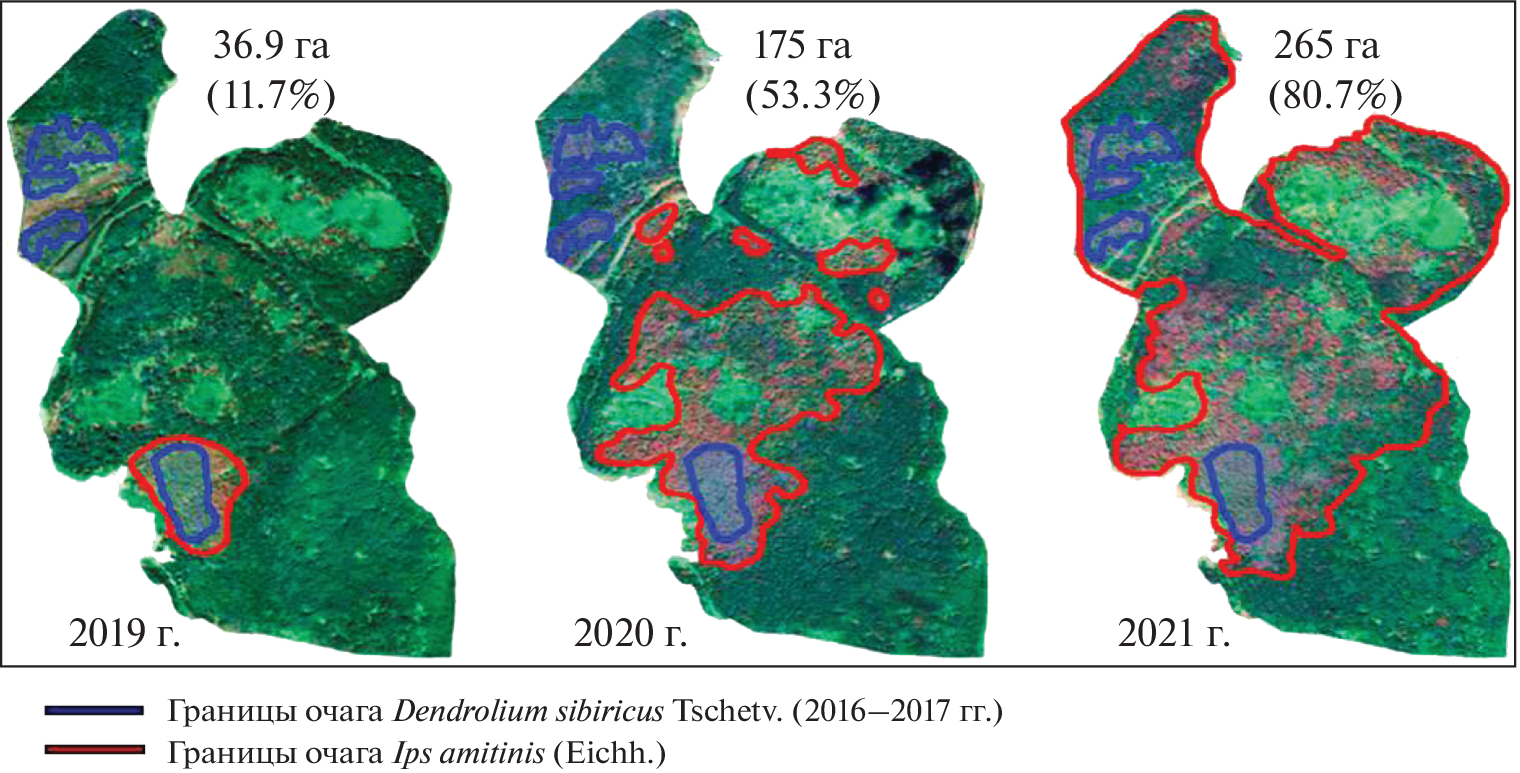 The results of studying the mass reproduction outbreak of a new invasive pest of the Siberian pine (Pinus s-ibirica Du Tour), the small spruce bark beetle (Ips amitinus (Eichh.)), observed in Siberia for the first time, are presented in this paper. The studies were carried out in the south-eastern part of Western Siberia, within the Tomsk region, in pine forests damaged by an invasive bark beetle. It is shown that the occurrence of the outbreak was provoked by favourable weather conditions of recent decades and the abundance of trees, weakened for various reasons, in the recipient ecosystems of the invasion, among which the outbreak of the Siberian moth in 2016–2018 was of great importance. The small spruce bark beetle population dynamics in new habitats was compared with the native area in Europe, and certain peculiarities were revealed: an increase in the populations’ numbers level, a narrowing of trophic specialisation up to a regional monophagy, a decrease in the role of an interspecific competition due to the displacement of local stem dendrophagous species by the invader, the simultaneous existence of outbreak foci in different development stages and the correlation between their characteristics, the species composition of the forest stands and the weakening factors. An original method for assessing the spreading risk for an outbreak of the small spruce bark beetle breeding in the Tomsk region under the influence of a complex of factors that contribute to an increase in its number has been proposed and implemented at the forestries level.