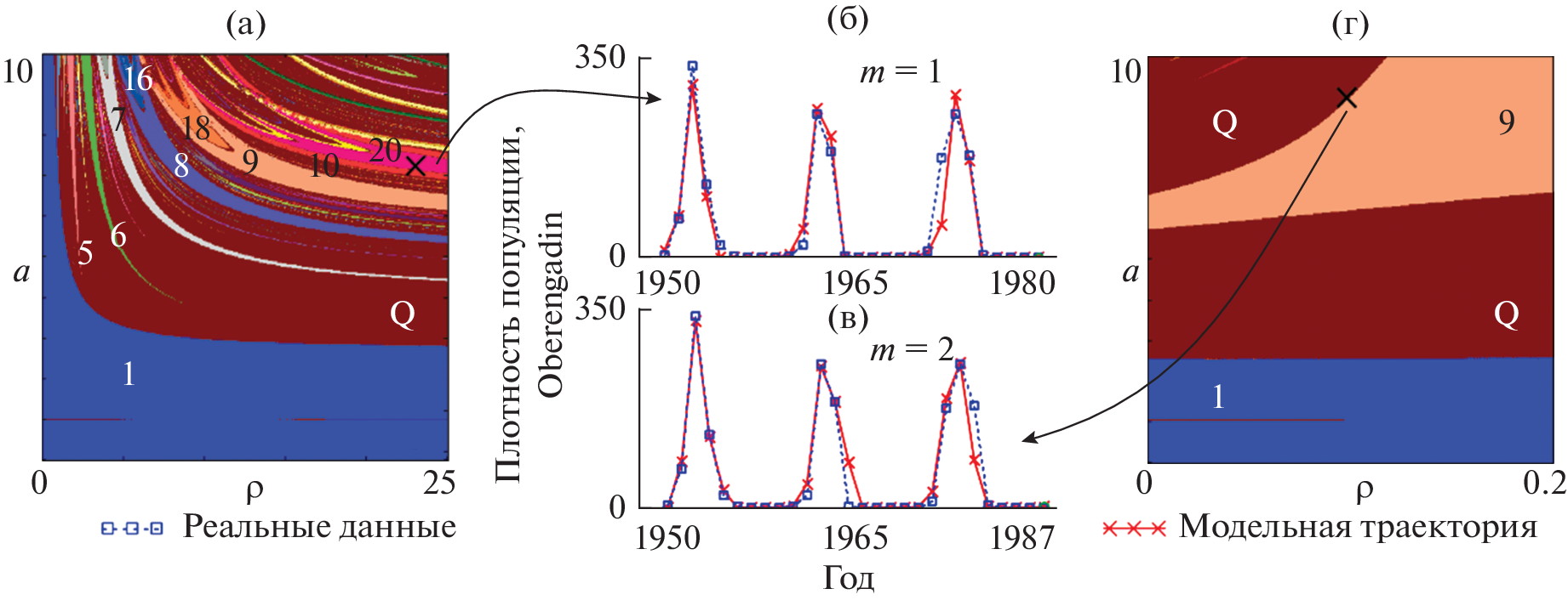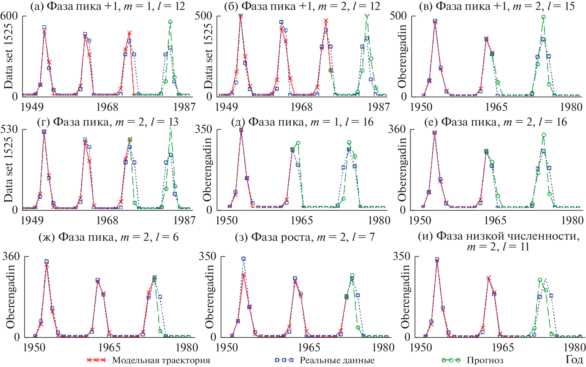 Модель Морана–Рикера с запаздыванием 1 и 2 года, учитывающая внутрипопуляционные саморегуляторные механизмы, применяется к описанию динамики плотности двух популяций листовертки лиственничной (Zeiraphera griseana). Используются данные о популяциях, обитающих в Швейцарии в локациях Graubunden (the Global Population Dynamics Database: Data set 1525 (Baltensweiler, Fischlin, 1988)) и Oberengadin (Baltensweiler, 1991). Оценки значений параметров моделей находились путем минимизации суммы квадратов отклонений эмпирических и модельных траекторий. Показано, что найденные точечные оценки популяционных параметров удовлетворяют статистическим критериям и располагаются в области квазипериодических колебаний, как правило, соседствуя с другими динамическими режимами. Следовательно, вариация демографических параметров, например, в результате эволюционных процессов или же влияния модифицирующих факторов может привести к смене динамического режима. Чтобы проверить прогностические свойства этих моделей, часть данных была использована для оценок значений параметров, а оставшаяся часть – для сопоставления реальной динамики и модельного прогноза. Как оказалось, качество прогноза существенно зависит от характера динамики в конце обучающей выборки, используемой для оценки параметров. Наилучший прогноз будет получен, если обучающая выборка заканчивается на фазе пика численности. В случае фазы низкой численности прогноз может характеризоваться приемлемой ошибкой, однако характер прогнозируемой динамики может измениться: например, произойдет смещение пика численности. Для Data set 1525 проведено сопоставление точечных оценок, полученных по обучающей выборке разной длины, с динамическими режимами модели Морана–Рикера. Это позволило получить представление об эволюции динамических режимов в популяции листовертки лиственничной и выявить переходы от одних динамических режимов к другим.