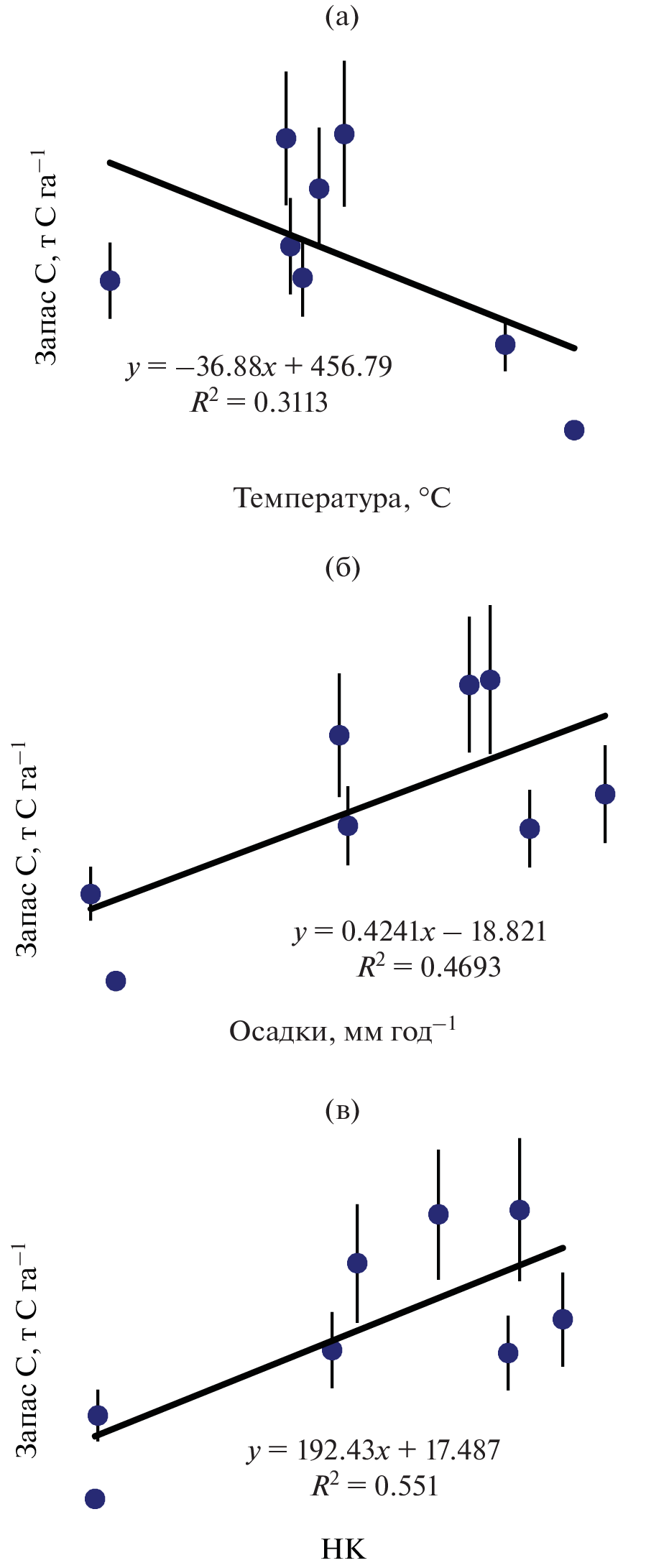 Modern global climate change manifests in an ever intensifying fashion, affecting anthropogenic and natural systems. Bioclimatic models predict significant shifts in biome boundaries, including a reduction in the forests’ proportion in the forest-steppe areas. This process can also affect carbon stocks. The aim of the work was to assess the impact of climate and its changes on the values and their changes of the phytomass’ carbon stocks of forest stands according to the data of repeated surveys of permanent sample plots. In the southern regions of the European Russia, 8 forests were selected and trial plots were set up. Repeated surveys were carried out on the test plots in 2010–2011, 2014–2015, 2019–2020. The carbon reserves of the living and the dead components of forest stands were calculated according to taxation characteristics. The litter carbon stocks were determined by the gravimetric method. The meteorological information analysis was carried out using data from the meteorological stations closest to the objects of study. Average annual temperature for 1991–2020 increased compared to 1961–1990. by 1.13°C, which is 2.5 times more than the global average. At the same time, annual precipitation decreased from 448.2 mm to 445.4 mm. The average value of the G.T. Selyaninov’s hydrothermal coefficient for May-September during the 1961–1990 period was 0.85, and 0.79 during the 1991–2020 period. The stock of the phytomass carbon in the studied forest stands varied from 38.5 ± 7.4 t C ha–1 to 270.6 ± 52.8 t C ha–1. Repeated surveys revealed both increases and decreases in phytomass carbon stocks, which ranged from –23.8 to 31.9 t C ha–1 over a five-year interval. The phytomass carbon stocks and climatic characteristics analysis revealed a statistically significant correlation with the HTC for May-September. However, comparison of changes in phytomass with changes in the average annual temperature, annual precipitation and HTC for May-September did not reveal significant dependencies. The absence of significant correlations between changes in phytomass carbon and climatic parameters’ changes can be determined by the forest ecosystems’ stability, which ensures the preservation of their functions over several years intervals.