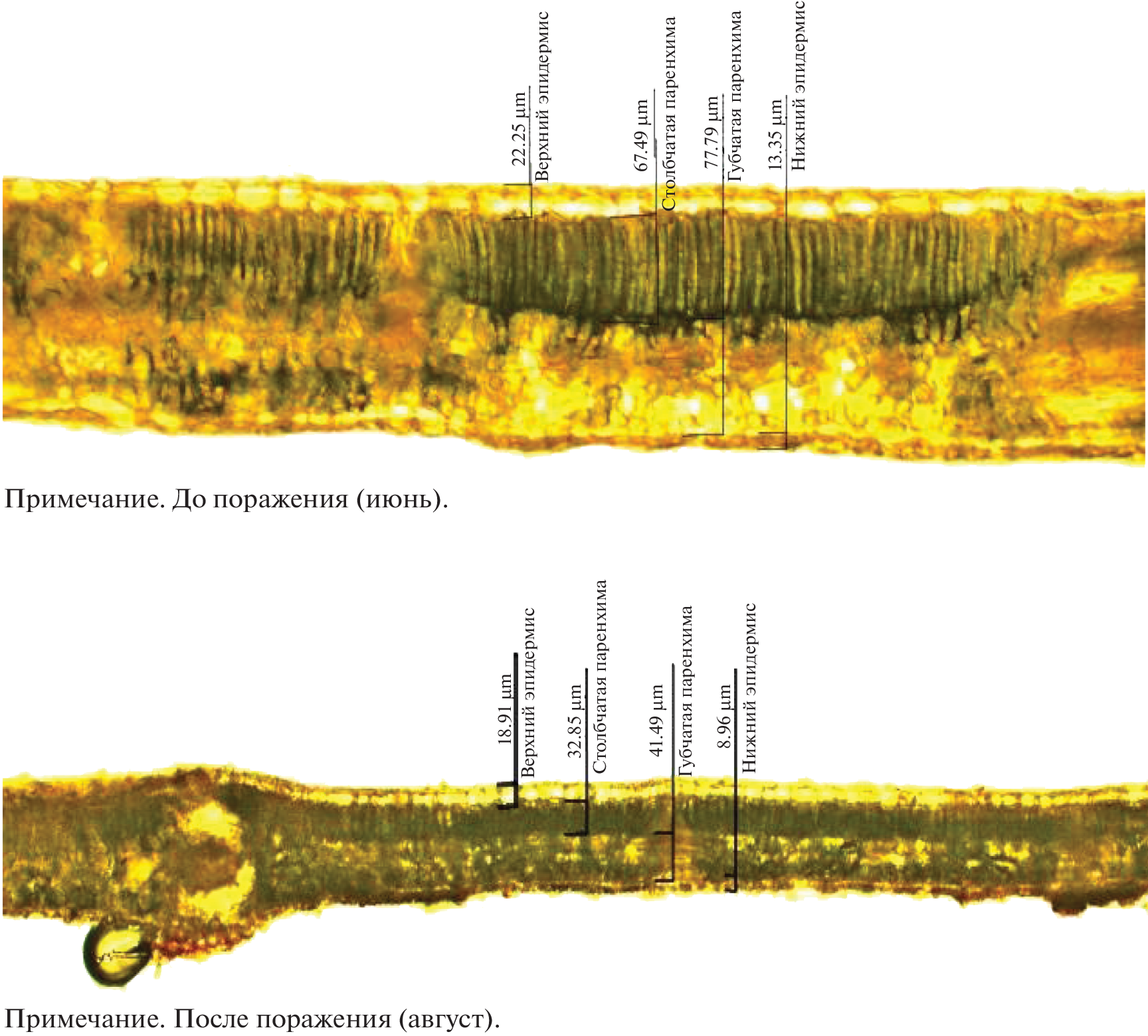 In 2015, an invasive oak lace bug (Corythucha arcuata) (Say, 1832), a representative of the North American fauna of lace bugs (Heteroptera: Tingidae), was discovered in the Krasnodar Territory. The main harmfulness of oak lace bug lies in it sucking the cell juices from the leaves, as a result of which their chlorosis develops, which can be especially dangerous and serve as a cause of repression and death of oaks. To assess the foraging impact of oak lace nug, we analysed the pigment composition of English oak (Quercus robur L.) leaves before and after infestation. The optical density of the extracted pigments was measured on a spectrophotometer. The functional state of the photosynthetic apparatus was assessed using a portable chlorophyll fluorometer. As a result, a significant decrease in the content of the main photosynthetic pigment, chlorophyll, as well as carotenoids was found, which indicates the suppression of the plant’s nonspecific protective mechanism. In parallel, there occurs a decrease in the photosynthetic activity coefficient and the vitality level. However, these negative processes are at least partially offset by an increase in chlorophyll b, which prevents the inhibition of CO2 assimilation. Pest damage causes a significant decrease in leaf thickness, mainly due to a decrease in the biometric parameters of spongy and columnar parenchyma.