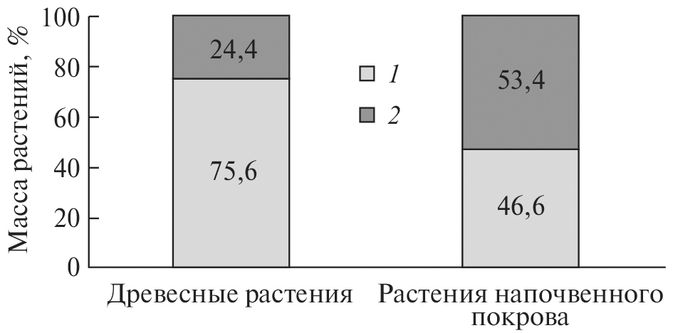 Масса растений напочвенного покрова в исследуемом сообществе составляет 3 ± 0.25 т га–1. В ее структуре приоритетную роль выполняют растения травяно-кустарничкового яруса, которые по формированию резервуара органического вещества во многом превосходят растения мохового покрова. Распределение массы растений данного яруса по компонентам следующее: корни трав и кустарничков — 53.4%, мхи — 36.6%, кустарнички — 5.6%, полукустарнички — 0.9%, лишайники — 0.7%, надземные органы трав — 2.8%. В целом массы подземных и надземных органов данного яруса примерно одинаковы (рис.). По исследованиям И. Г. Грозовской с соавторами (2015), в условиях Костромской области в ельнике черничном масса растений напочвенного покрова составляет 5.2 т га–1 и подземная масса немного выше, чем надземная.