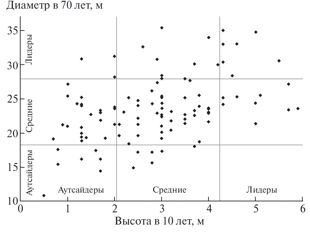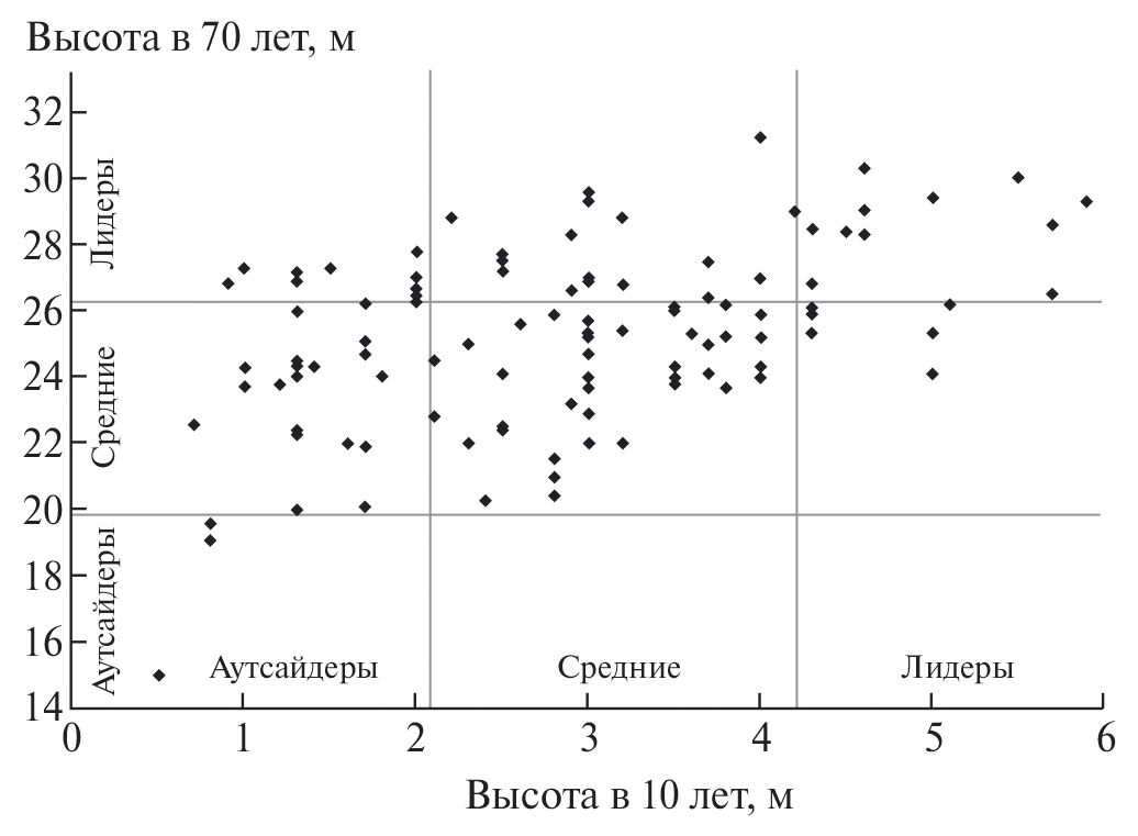 Для практики лесного хозяйства важно выделять деревья-лидеры и близкие к ним по признаку высоты средние деревья. Положительными являются своевременные рубки ухода по классическому низовому методу, т. е. приемы с вырубкой наиболее отстающих в росте деревьев. Из практики рубок ухода должны быть исключены верховой и комбинированный методы уходов, при которых вырубаются деревья-лидеры и лучшие экземпляры из числа средних деревьев, что уже давно подтверждено отрицательными результатами таких приемов на ряде экспериментальных объектов (Георгиевский, 1948; Мерзленко и др., 2008). Что касается средних деревьев, то они более стабильны по своему ранговому положению.