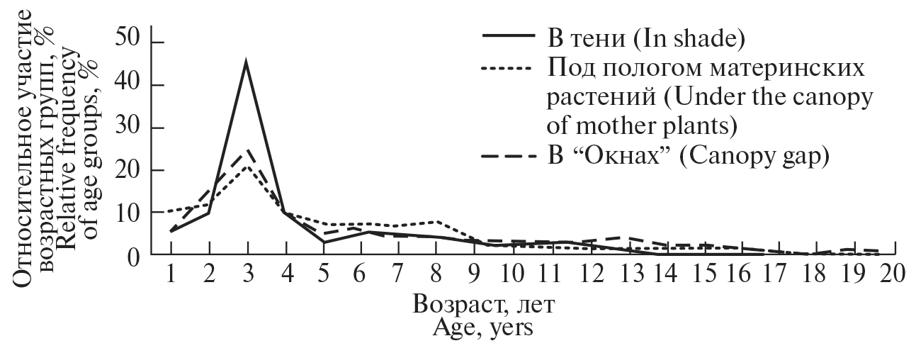 По относительному участию под плотным пологом древесного яруса лиственных пород можно выделить три возрастные группы. Первая (от 1 года до 3 лет, с накоплением подроста) составляет 61.6% от общего количества данного сообщества (рис. 1, табл. 1). Кроме того, численность мелкого подроста в тени выше таковой в условиях “окон” и под материнским пологом.
