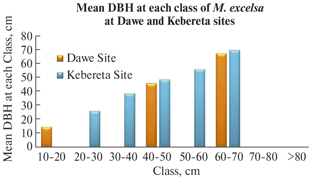 M. excelsa DBH-class were dispersed irregularly in the Dawe and Kebereta site natural forests (since they are distributed differently in almost all classes). Some DBH classes had a large number of individuals while other DBH classes had a small number of individuals and even some were missed (Fig. 4), probably due to selective cutting by the local people for construction and firewood.