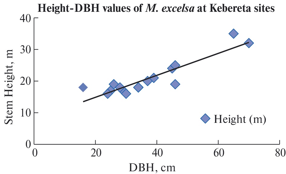 Fig. 5. The linear trend line of height-DBH values of M. excelsa at the Kebereta site.
