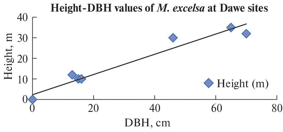Fig. 6. The linear trend line of height-DBH values of M. excelsa at the Dawe site.