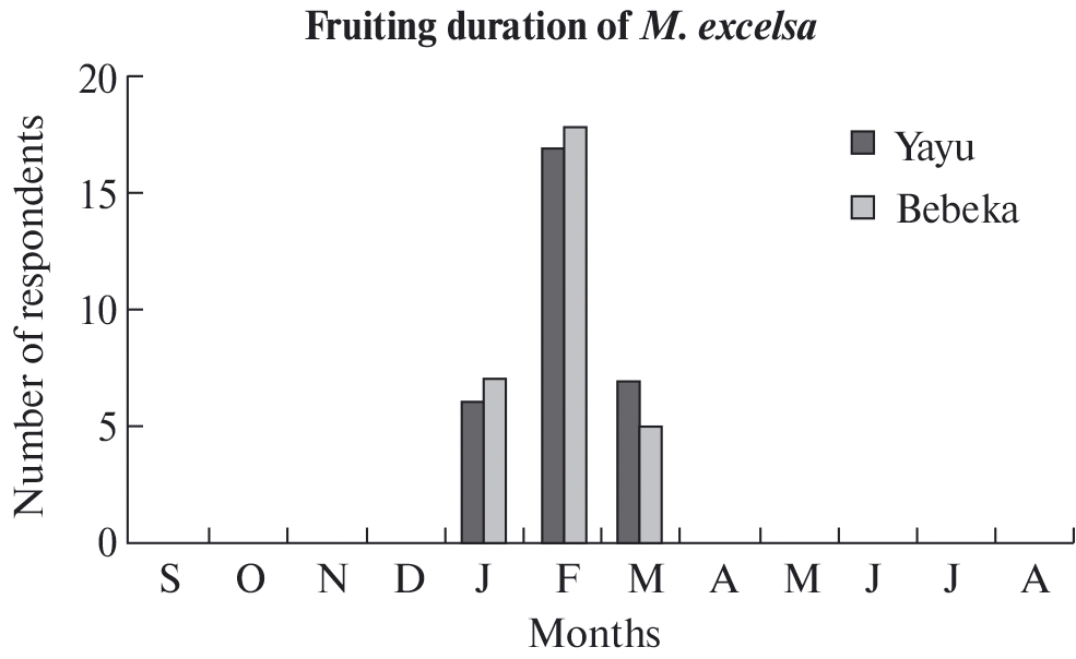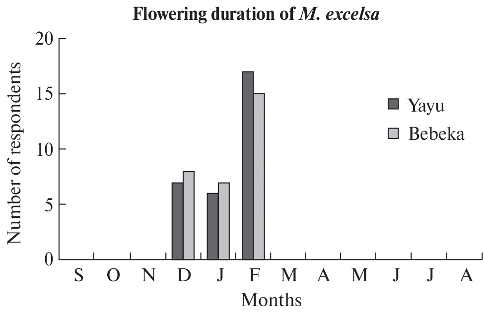 Most respondents mentioned February as the month for flower initiation and expansion of M. excelsa in both selected sampled natural forest areas. Out of 60 interviewed households, 56.7% from Yayu and 50% from Bebeka respectively named February, 20% and 23.3% of the interviewed HHs from Yayu and Bebeka respectively confirmed January, and the remaining 23.3% of elders from Yayu and 26.7% of elders from Bebeka stated December. The most popular answer in the HH questionnaires showed that the exact fruiting duration of M. excelsa was during February since 56.7% and 60% respondents from Yayu and Bebeka respectively confirmed that the event occurred in this month. The other 20% / 23.3% and 23.3% / 16.7% from Yayu / Bebeka stated January and March, respectively.