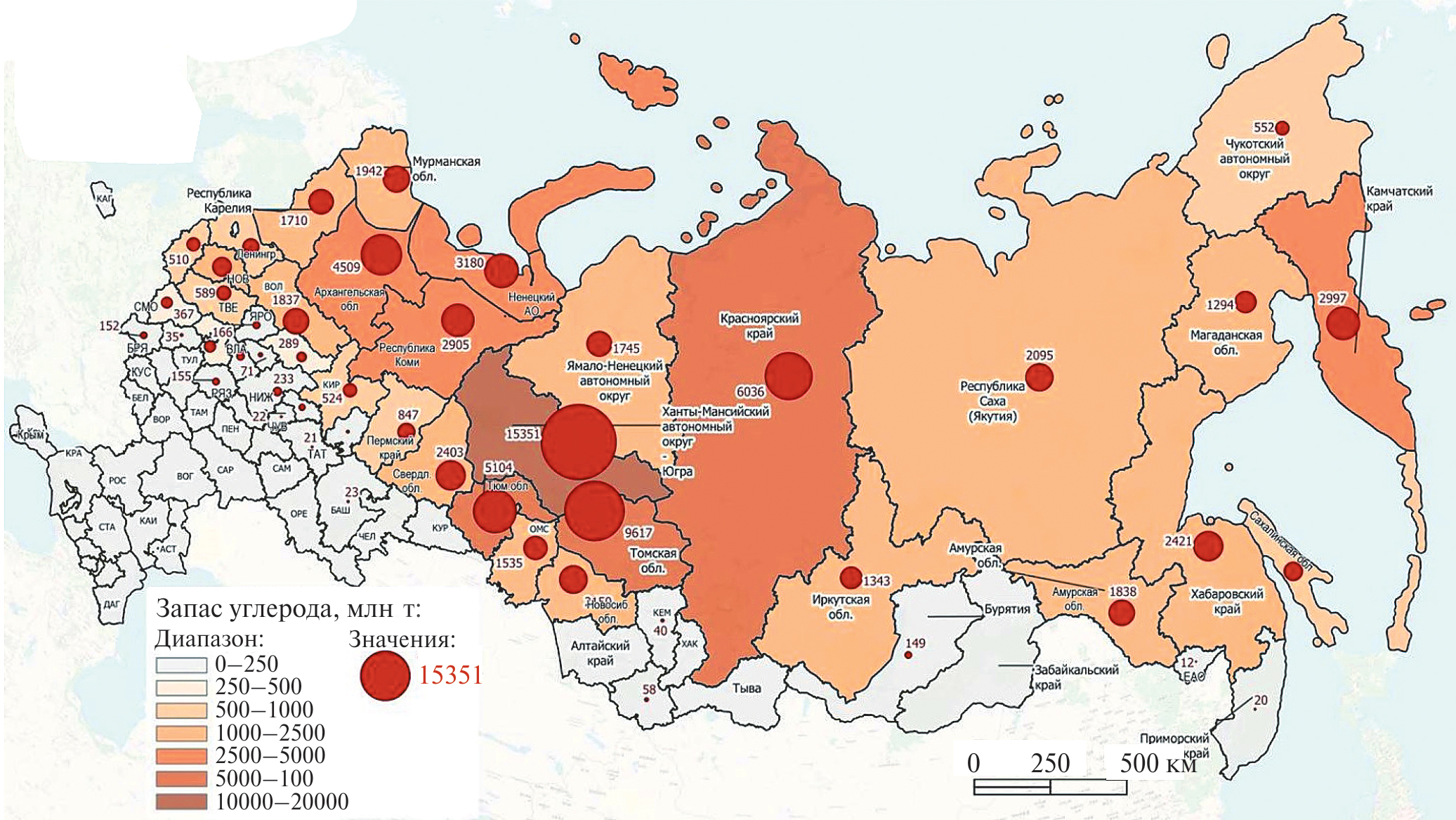 По удельным запасам углерода можно косвенно судить о мощности торфа, степени увлажнения территории в субъекте. Не всегда крупный субъект Российской Федерации вносит существенный вклад в удельный запас углерода в торфе.