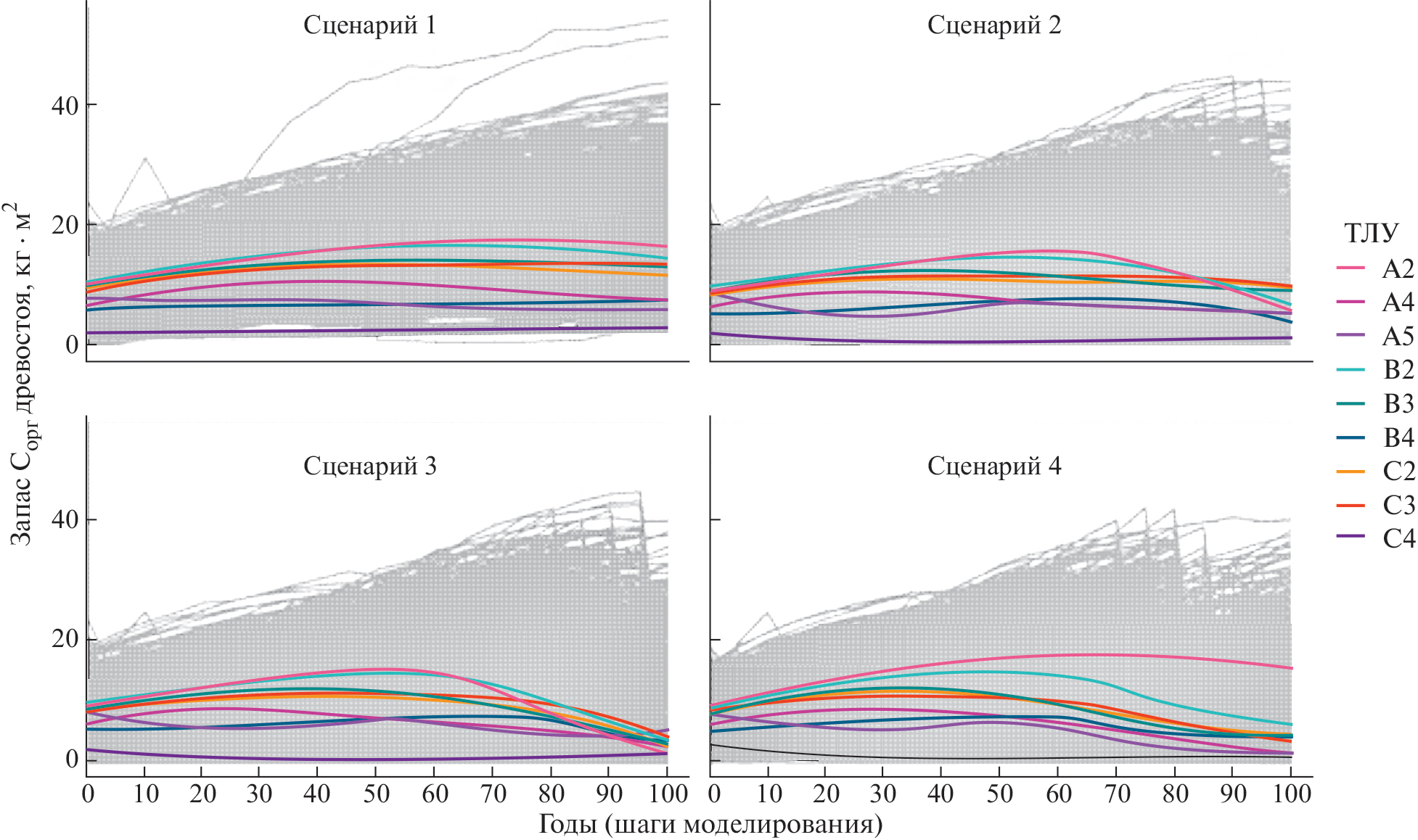 Рис. 1. Динамика запаса углерода древостоя Данковского лесничества (серые линии соответствуют отдельным таксационным выделам; цветные линии — медианные значения для разных ТЛУ; описание сценариев дано в табл. 3).