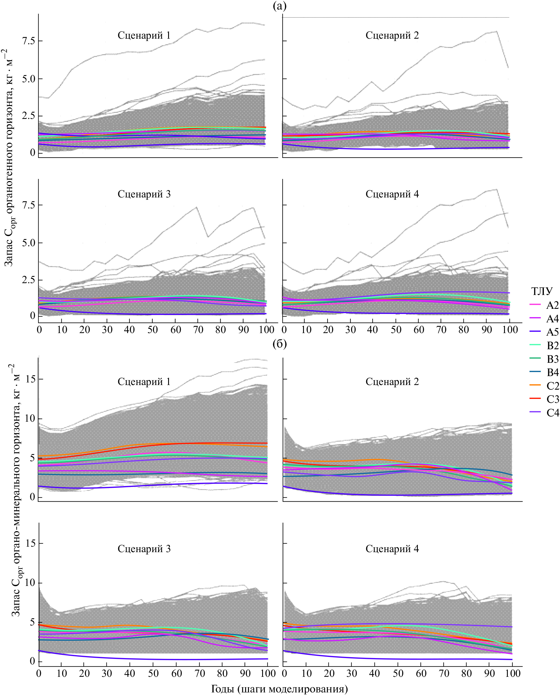 Рис. 2. Динамика запасов углерода в лесной подстилке (а) и органо-минеральных горизонтах почв (б) Данковского лесничества (серые линии соответствуют отдельным таксационным выделам; цветные линии — медианные значения для разных ТЛУ; описание сценариев дано в табл. 3).