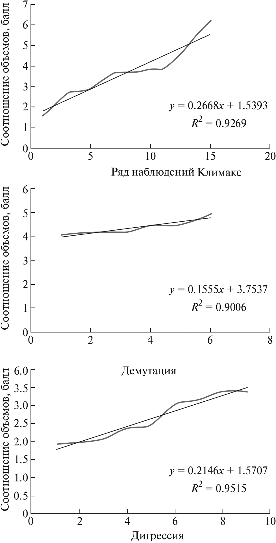Содержание рисунка и табл. 3 демонстрирует величину этих связей при разных динамических положениях лесных сообществ, включающих показатели корреляционных отношений — R2 (рис.). На базе этих же рядов наблюдений вычислены коэффициенты линейных корреляций для малых выборок (Дворецкий, 1971). Получены следующие результаты: для выборки еловых биогеоценозов дигрессивных фаз динамики связь искомых предикторов имеет показатели: r = 0.9 при mr = 0.06 и t = 15.0; демутационных фаз динамики — r = 0.98 при mr = 0.016 и t = 6.12; климаксовых — r = 0.84 при mr = 0.08 и t = 10.5.