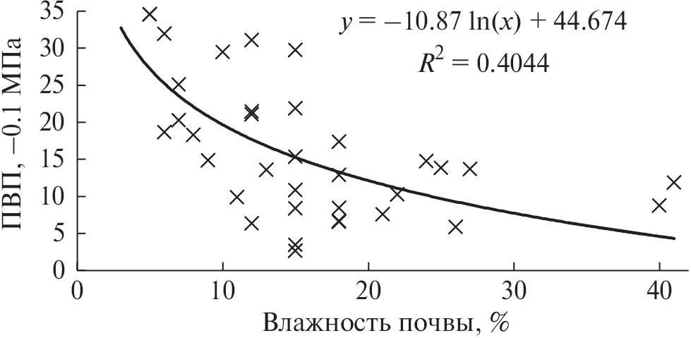 Почва в вегетационных сосудах дерново-слабоподзолистая супесчаная, была взята в сосняке разнотравном на территории Серебряноборского лесничества. При определении ПВП в это же время определяли влажность почвы термостатическим методом. Взаимосвязь ПВП и влажности почвы в сосудах с саженцами показана на рис. 1. При построении графиков зависимости фотосинтеза от водообеспеченности использовали ПВП листа (хвои) конкретного саженца.