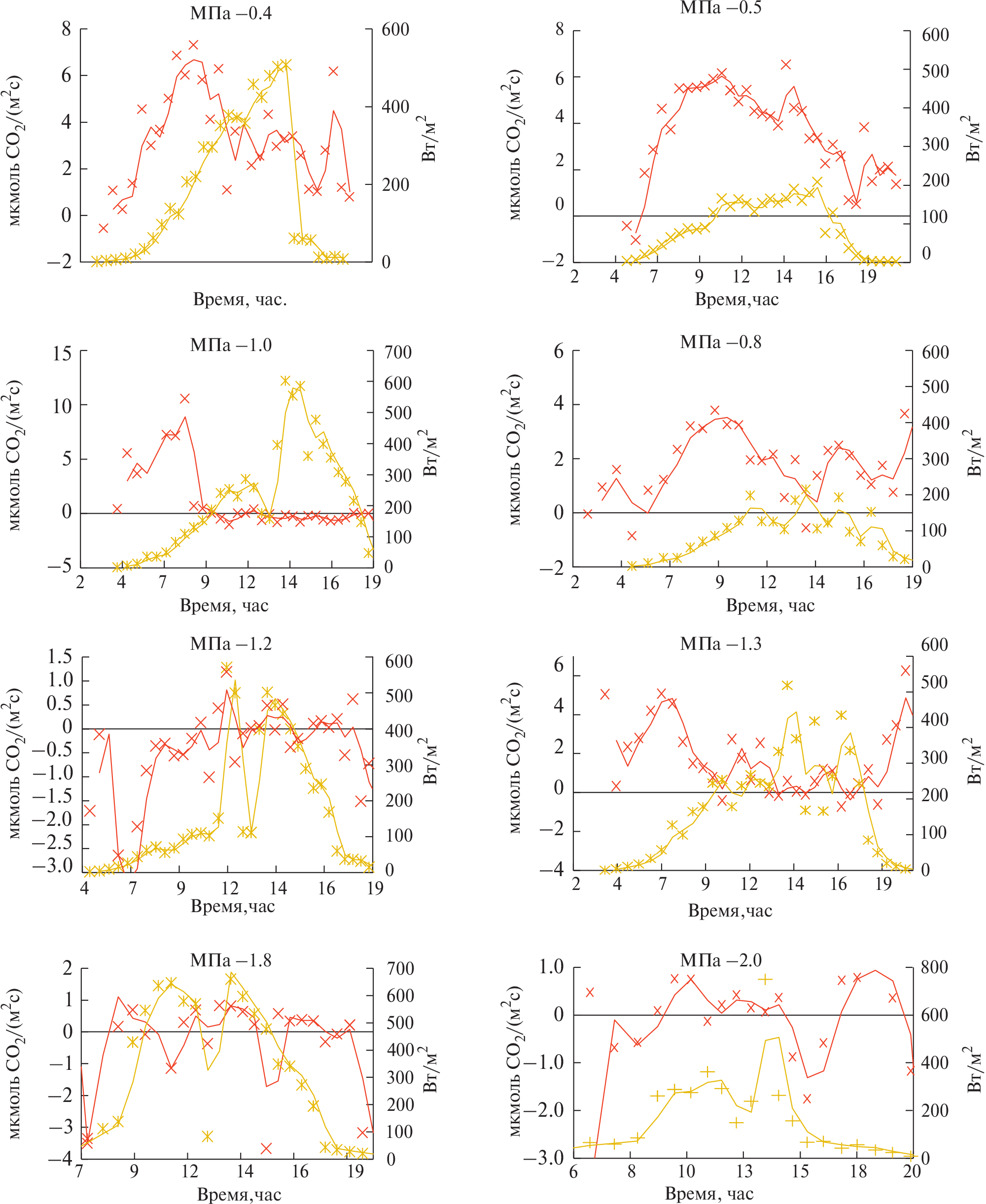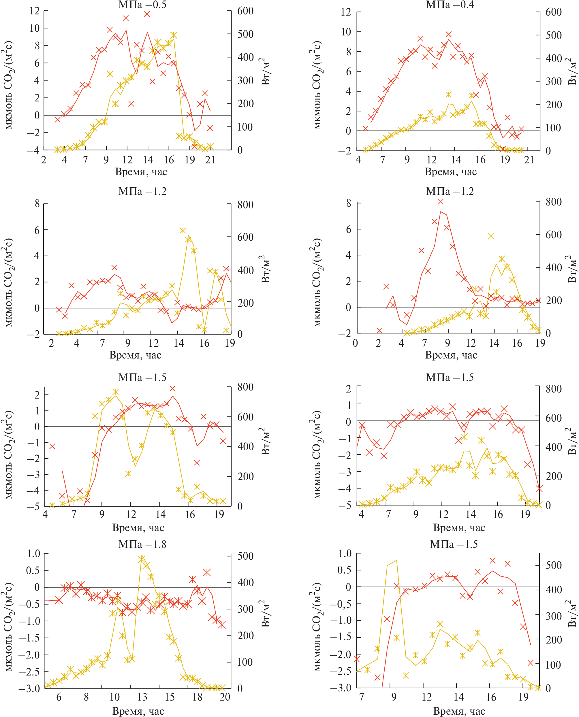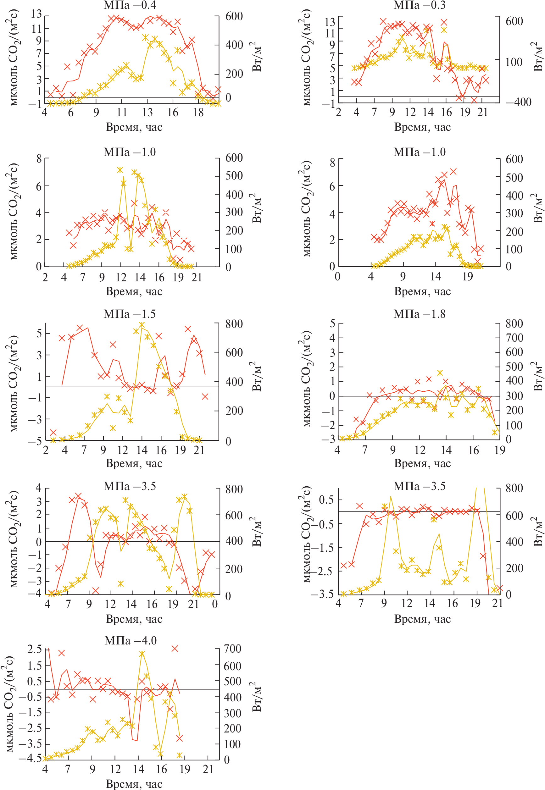 Рис. 2. Дневной ход интенсивности фотосинтеза саженца ели в дни с переменной (слева) и сплошной облачностью (справа) при различной водообеспеченности, — МПа: интенсивность фотосинтеза, интенсивность солнечной радиации.