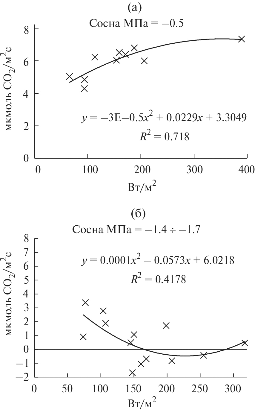 На примере сосны рассмотрим, как изменяется среднедневная интенсивность фотосинтеза от солнечной радиации при оптимальной и при недостаточной водообеспеченности. При построении среднедневной зависимости интенсивности фотосинтеза от среднедневной солнечной радиации оказалось, что с увеличением интенсивности солнечной радиации за день интенсивность фотосинтеза при оптимальном водообеспечении (–0.5 МПа) увеличивается (рис. 5, А), тогда как при недостаточном водообеспечении (–1.4 ÷ –1.7 МПа) среднедневная интенсивность фотосинтеза снижается (рис. 5, Б). Если при недостаточном водообеспечении при среднедневной солнечной радиации 150 ÷ 200 Вт м–2 интенсивность фотосинтеза была около 0, то при оптимальном водообеспечении она была около 6 мкмоль СО2 м–2 с–1. При среднедневной солнечной радиации 100 Вт м–2 при недостаточном водообеспечении среднесуточная интенсивность фотосинтеза была около 2 мкмоль СО2 м–2 с–1, а при оптимальной влагообеспеченности — около 5 мкмоль СО2 м–2 с–1.