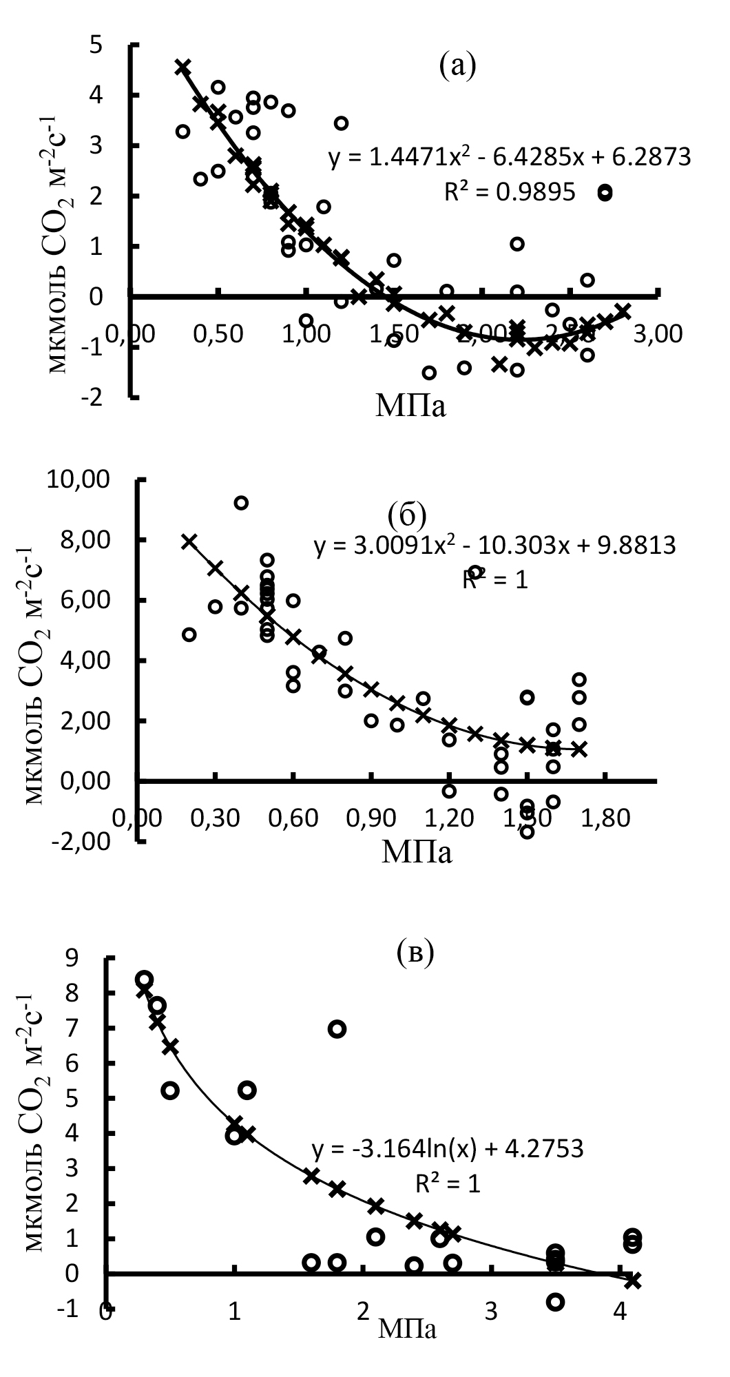 Для определения недостатка водообеспеченности на интенсивность фотосинтеза мы, как и многие исследователи (Castell, Terradas, 1995; Jiang, Macdonald, Zwiazek, 1995; Kellomäki, Wang, 1996; Bauerle et al,, 2003; Xu, Baldocchi, 2003), использовали зависимость газообмена фотосинтетических органов от предрассветного водного потенциала листьев или хвои (ПВП). В последнее время исследователи Карелии широко использовали в своих исследованиях водный потенциал растений (Придача и др., 2014, 2018, 2019; Сазонова, Придача, 2015; Сазонова и др., 2016, 2017; Тихова и др., 2017; Придача и др., 2018а, 2018б; Сазонова, Придача, 2020).