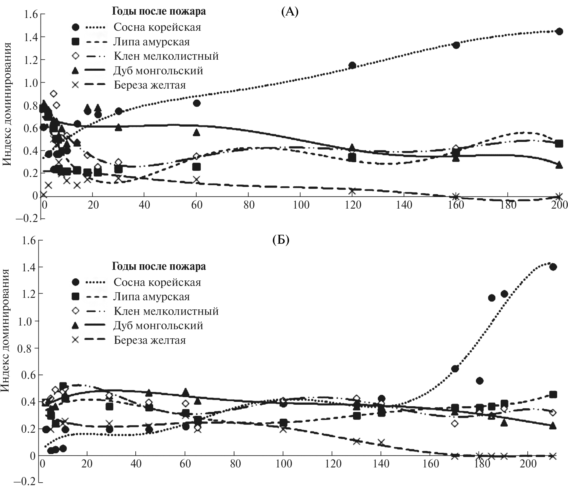 Рис. 3. Изменение индексов доминирования и полиномиальные линии тренда у пяти древесных видов в ходе лесовосстановительных сукцессий после беглых низовых пожаров с частично сохранившимся древостоем (А) и после устойчивых низовых пожаров с сильно нарушенным древостоем (Б).