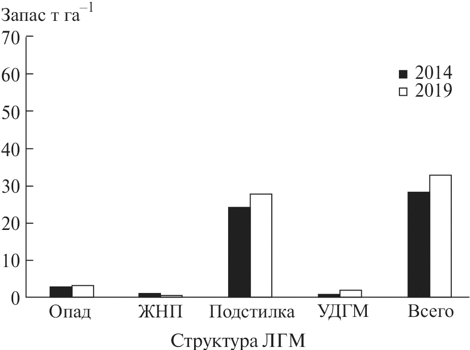 Общий запас ЛГМ через 2 года после проведения экспериментального выжигания 2014 г. средней силы увеличился на 19% и стал равен 44.0 т га–1. Доля запаса подстилки составила 85% (или 37.6 т га–1), что превысило допожарный показатель. Запас опада увеличился на 11% и достиг 5.2 ± 0.79 т га–1. В структуре опада изменилось соотношение фракций. Снизилась доля хвои до 41%, увеличилась в 6 раз доля шишек (41%). На ветошь и кору приходилось 0.6 и 17% соответственно. Фитомасса ЖНП составила 0.09 ± 0.01 т га–1. Запас УДГМ увеличился незначительно, до 1.3 ± 0.16 т га–1. После пожара уменьшилась доля первых двух классов диаметров (18 и 20% соответственно) и увеличилась доля УДГМ 3-го класса (1.0–2.99 см) до 63%. Запас проводников горения превысил допожарное значение и составил 42.7 т га–1, главным образом за счет увеличения запаса подстилки и опада.