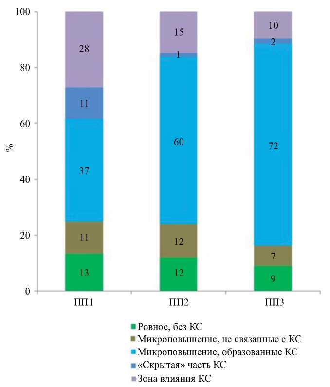 Рис. 1. Распределение подроста P. abies по типам микроместообитаний на трех ПП. По оси абсцисс — ПП; по оси ординат — доля подроста, размерность — %.