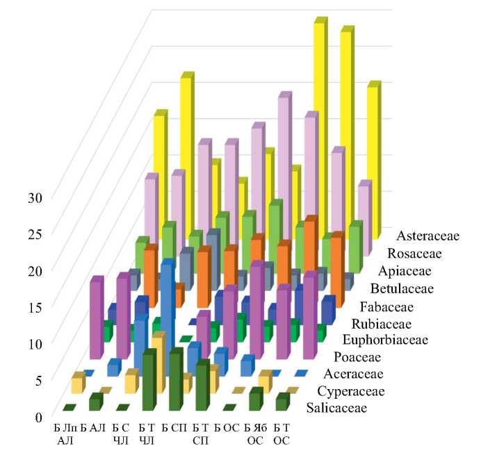 Общее количество видов в лесополосах варьирует, максимальное число видов (63) выявлено в чистой березовой лесополосе АЛ, минимальное (13) — в лесополосе береза-тополь ЧЛ. При этом количество видов положительно коррелирует с длиной лесополосы (0.67). Ведущими семействами во флоре лесополос являются Сложноцветные (22 вида), Шиповниковые (14), Бобовые (10), Сельдерейные, Мятликовые (по 9 видов), Капустные, Гвоздиковые, Норичниковые (Scrophulariaceae) (по 5 видов), Яснотковые, Ивовые (Salicaceae) (по 4 вида). Во всех лесополосах с березой повислой представлены виды четырех семейств: Сложноцветных, Шиповниковых, Сельдерейных, Березовых (Betulaceae), в восьми из девяти изученных лесополос — виды семейств Бобовых, Мареновых (Rubiaceae), Молочайных (Euphorbiaceae), в семи лесополосах — виды семейств Мятликовых, в шести — Кленовых (Aceraceae), Осоковых (Cyperaceae), Ивовых (Salicaceae) (рис. 1).