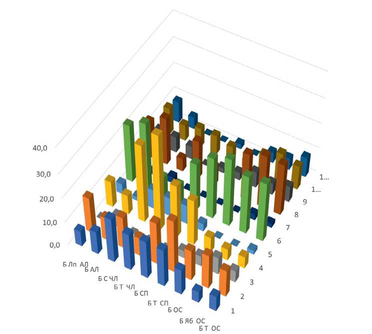 Состав лесополос | Б Лп | Б | Б С | Б Т | Б | Б Т | Б | Б Яб | Б Т |