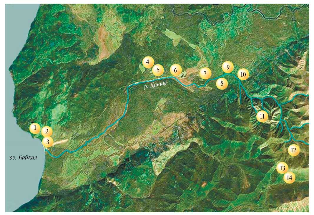 Рис. Расположение учетных энтомологических площадей на высотной трансекте западного макросклона Баргузинского хребта.