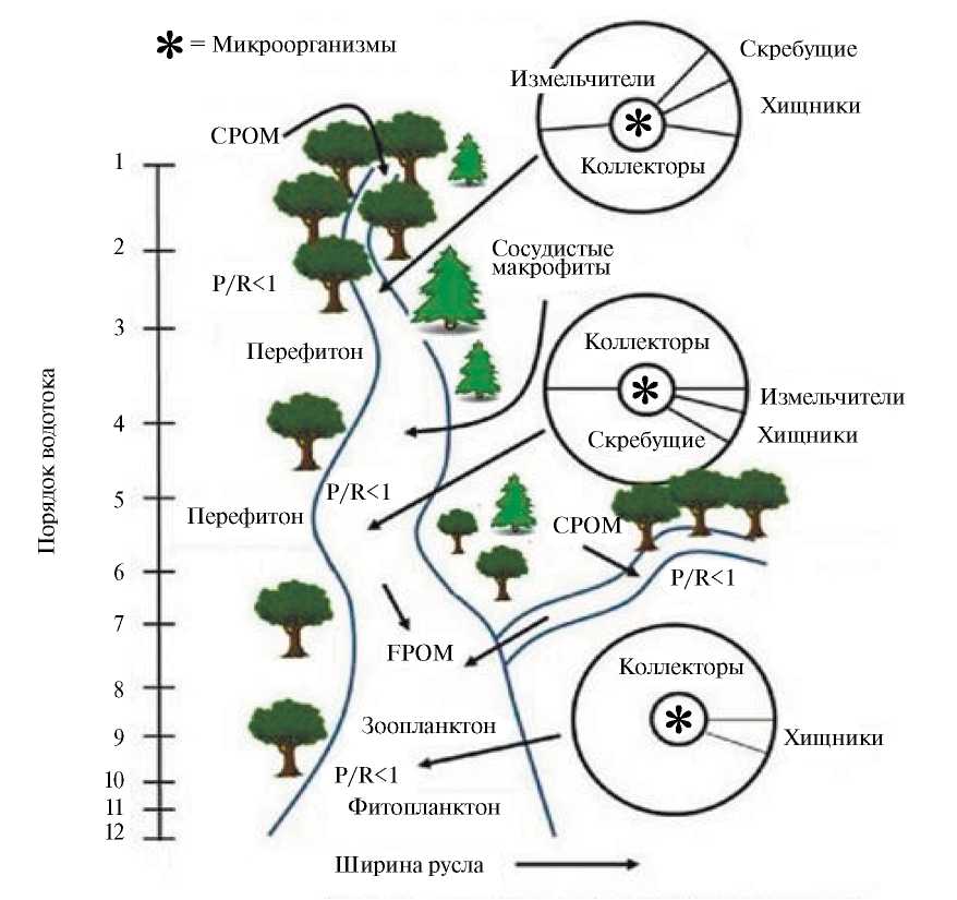 Верхние участки водотоков (ручьи 1—3 порядка) часто сильно затенены и получают большое количество органического вещества от прибрежной растительности, являясь гетеротрофными зонами, где соотношение валового фотосинтеза (P) к дыханию (R) меньше единицы (рис. 3а). Здесь преобладают каменисто-галечные грубые субстраты, поскольку градиенты потока и эрозионные процессы высоки, на них формируются сообщества с преобладанием измельчителей, являющихся первыми механическими деструкторами листового опада. Листовой опад и продукты его первичной деструкции измельчителями относят к категории грубодисперсного органического вещества — CPOM (coarse particulate organic matter). При дальнейшем разложении СРОМ в процессе выщелачивания, микробной колонизации и минерализации, физической фрагментации происходит его дальнейшее измельчение и превращение в тонкодисперсное органическое вещество — FPOM (fine particulate organic matter), которое экспортируется водным потоком на нижние этажи водотока и улавливается из потока фильтраторами, а при отложении на дно — коллекторами-сборщиками. Далее FPOM трансформируется в растворенное органическое вещество DOM (dissolved organic matter), которое, в конце концов, способно коагулироваться в желатинообразные пеллеты — пищевой ресурс коллекторов-сборщиков (рис. 4).
