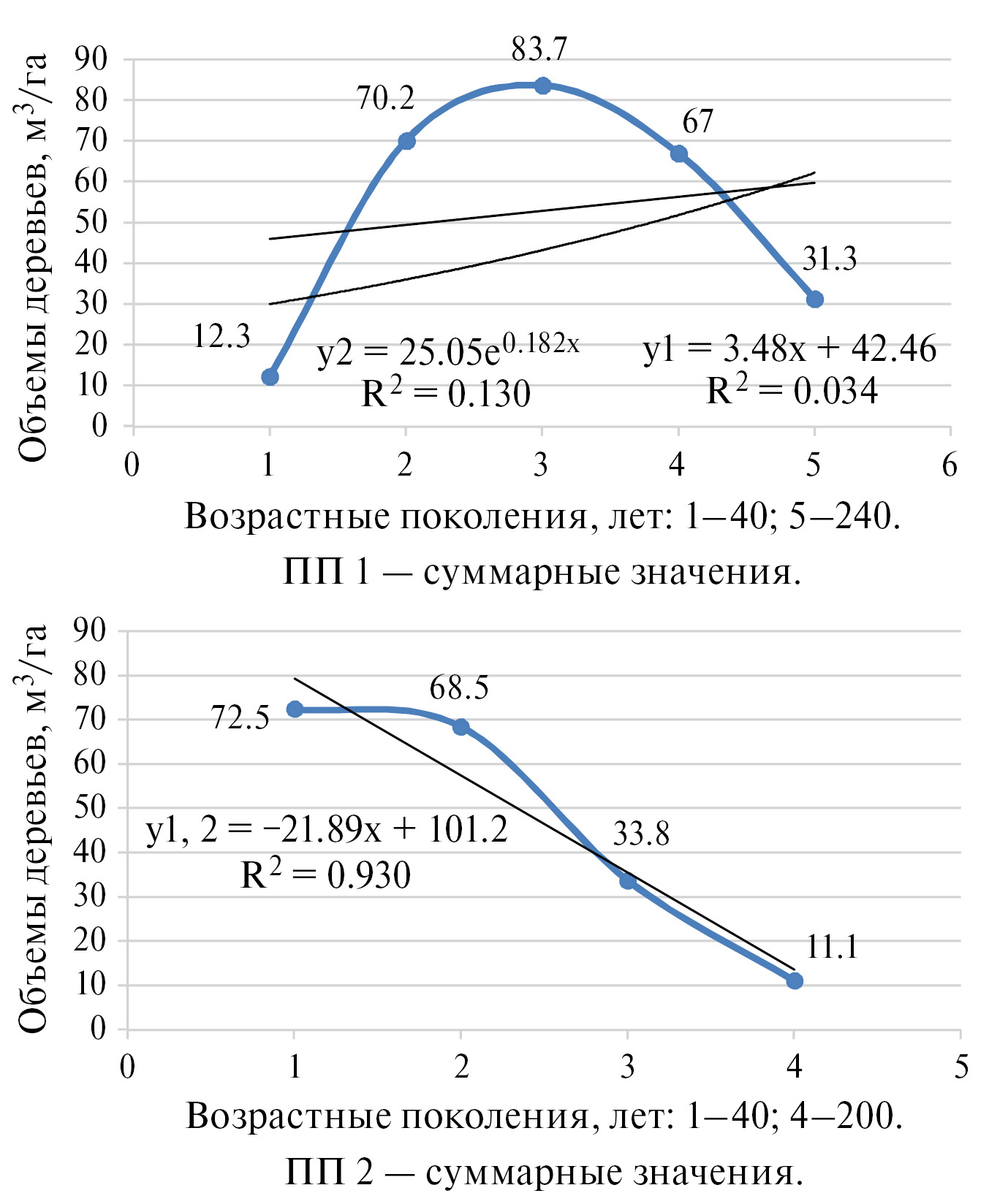 Статистический анализ величины связи объемов деревьев с их возрастом в возрастных поколениях для ПП 1 при линейном и экспоненциальном приближениях соответственно R2 = 0.034 и R2 = 0.130 – связь очень слабая. Для ПП 2 по обоим приближениям R2 = 0.930 – связь очень высокая, тесная, почти функциональная.