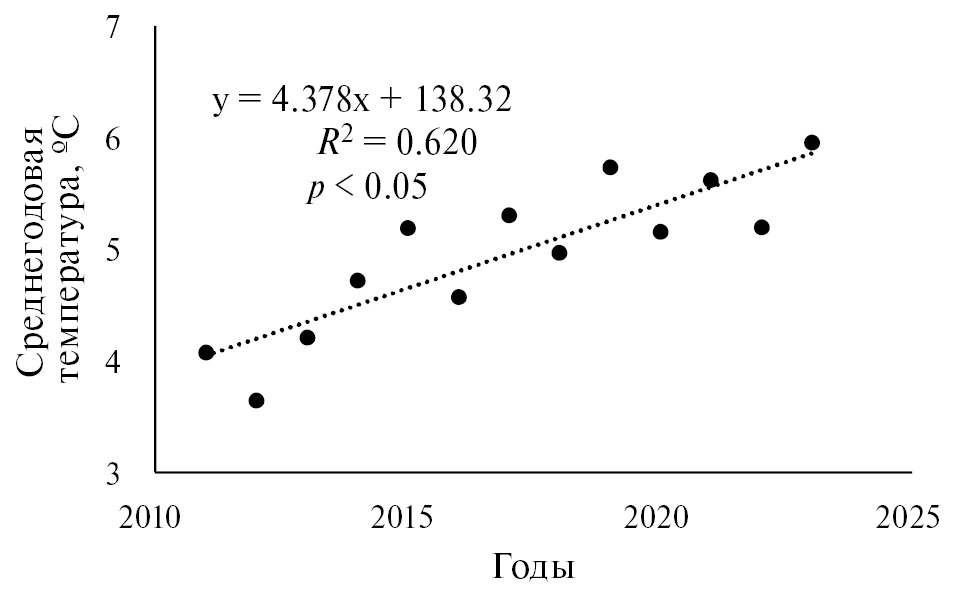 Динамика среднегодовой температуры. Данные по температуре воздуха метеостанции Тимирязевский представляют собой непрерывный ряд с частотой 8 значений в сутки за период 2011–2023 гг. За этот период получены среднегодовые значения температуры воздуха (рис. 1), которые образуют значимый тренд роста: среднегодовая температура воздуха в Уссурийском городском округе за 12 лет увеличивалась с темпом 0.15 °С в год (рис. 1). Различия между годами в сумме температур на конец лета доходят до 200 °С.