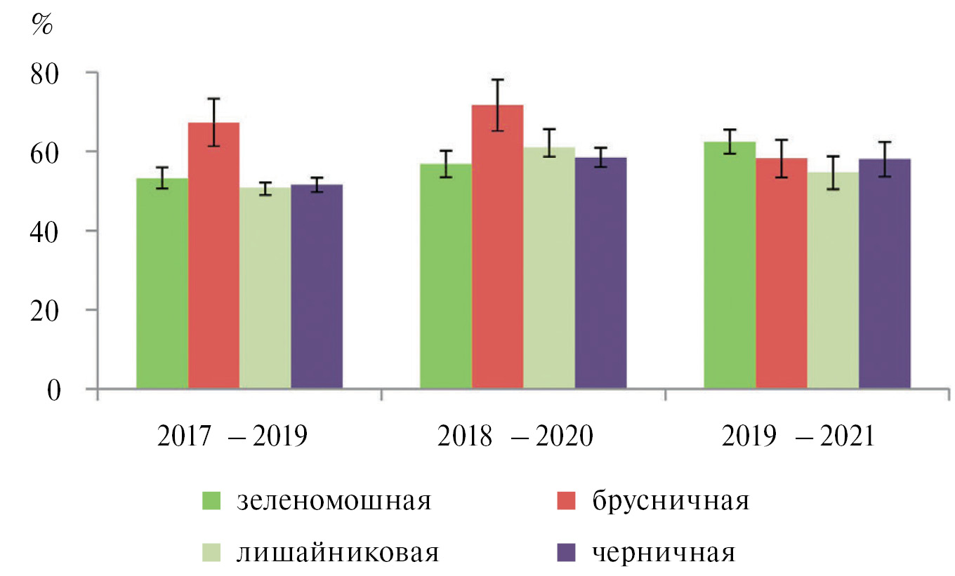 В подстилках различных микрогрупп напочвенной растительности деструкция хвои проходила достаточно равномерно. В течение полутора лет каждого из трех опытов было зафиксировано только одно значимое различие в разложении хвои в подстилке лишайниковой микрогруппы растительности (28.6 ± 1.1%), по сравнению с брусничной (33.6 ± 1.7%) и черничной (32.0 ± 1.3%) микрогруппами, что объясняется переувлажнением данной подстилки, имеющей наименьшую мощность и запас, на фоне высоких осадков (Солодовников, 2019). Отмечена повышенная деструкция хвои в брусничной микрогруппе после двух лет (67 и 69%) в двух опытах из трех, но различия с другими микрогруппами растительности значимы лишь в одном из них, что, возможно, является следствием локального распространения деструктивной микрофлоры и фауны в местах закладки опыта (рис. 2). Это подтверждается тем, что после смещения на метр места закладки третьего опыта в брусничной микрогруппе результат деструкции не отличался значимо от результата в других микрогруппах напочвенной растительности. Существует разница в разложении хвои в подстилке лишайниковой микрогруппы растительности в первом и втором экспериментах, однако, если рассматривать все три серии опыта в целом, значимых различий не наблюдается (Solodovnikov, 2021).