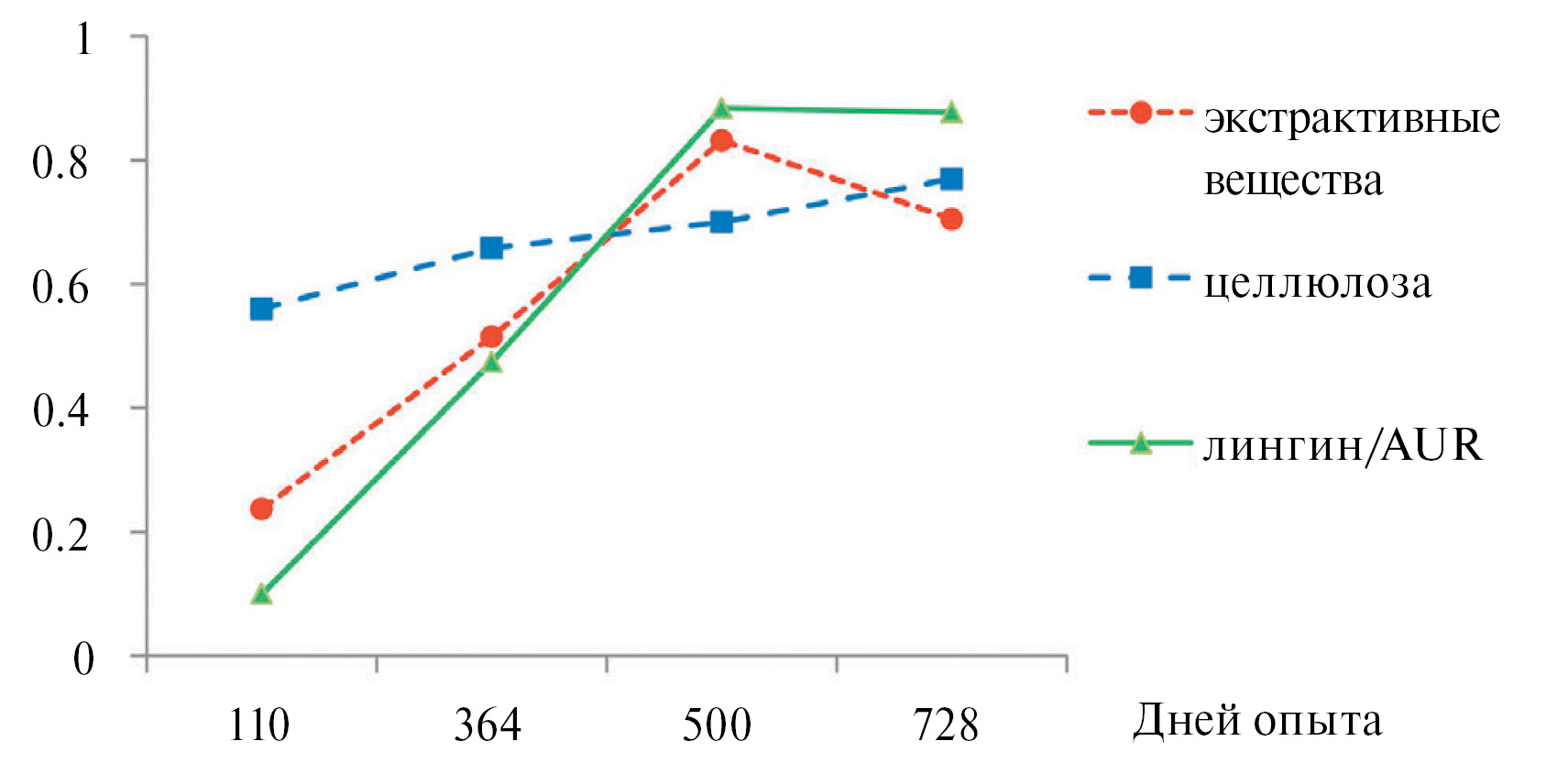 В нашем исследовании после 110 дней сравнение потери массы компонентов хвои с потерей общей массы показало наибольшее значение коэффициента корреляции для целлюлозы (0.55), тогда как корреляция с лигнином/AUR (0.1) имела наименьшее значение (рис. 3). После 500 дней опыта корреляция лигнина/AUR (0.88) была максимальной среди компонентов и превысила значения корреляции целлюлозы (0.7). Коэффициенты корреляции между потерей массы хвои и всех компонент стабильно росли с увеличением времени опыта. Это подтверждает тезис, что оставшиеся после быстрой в первой стадии потери вещества, как правило, лигнифицированы и их распад на более поздних стадиях регулируется распадом лигнина.