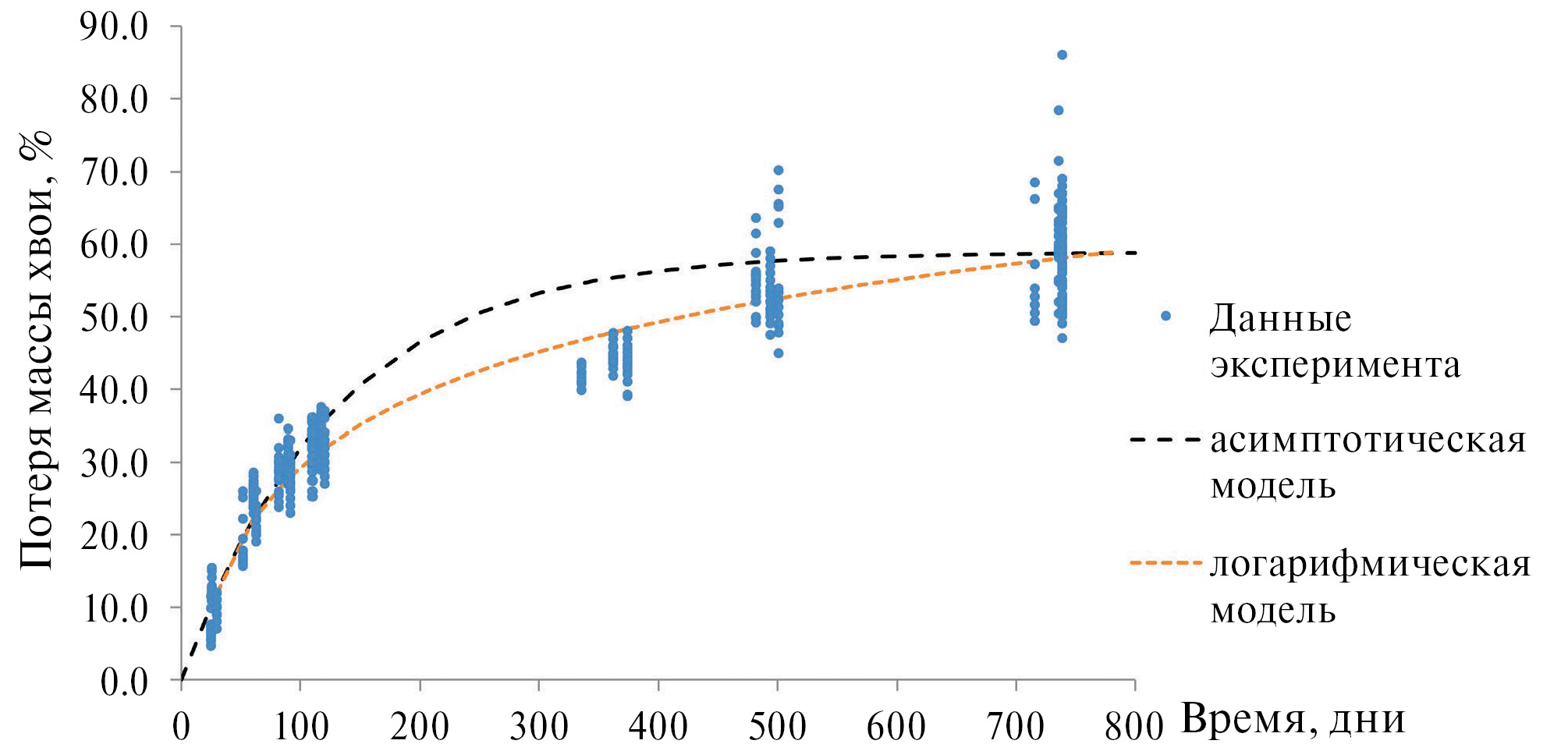 Данные трех экспериментов показали, что известная асимптотическая модель, применяемая для расчетов деструкции хвои, завышает величину годовой деструкции хвои примерно на 10 – 13%. Предложенная логарифмическая модель основана на двухгодичных эмпирических данных и дает погрешность в 3 – 5% в вычислении годовой потери массы хвои. Следует учитывать ограниченность ее применения как в рамках разлагаемого субстрата, так и во временных рамках. Модель не применима при значениях t<30. Тем не менее для периода от месяца до двух лет данная модель выглядит наиболее оптимальной, и потому, в зависимости от строгости требований к результату расчетов потери массы хвои, желательно применение логарифмической модели для указанного периода разложения вплоть до пересечения значений с асимптотической моделью.