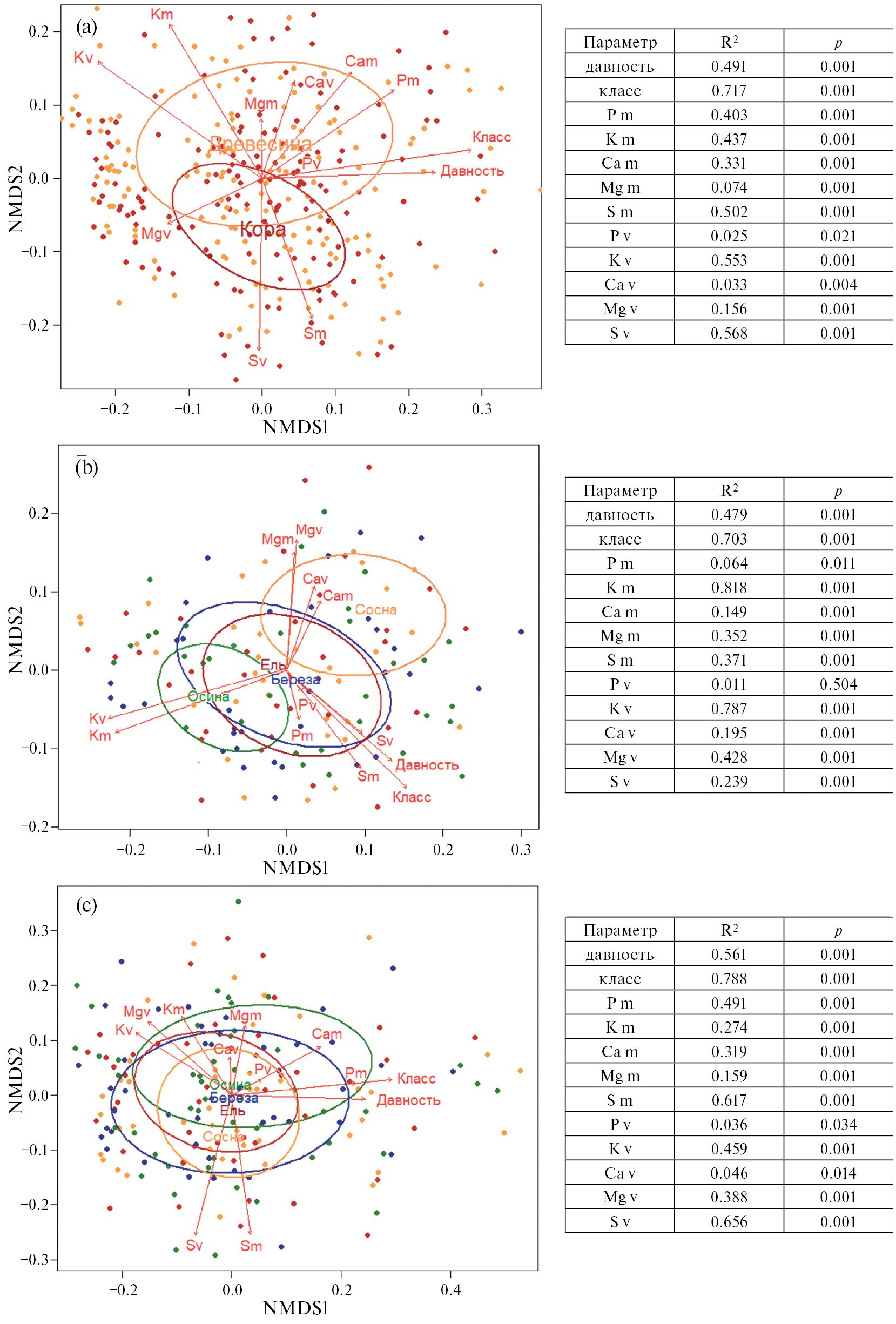 Древесина лиственных пород более богата биогенными элементами по сравнению с хвойными (Błońska et al., 2017). Это отчасти подтверждают и наши данные: значения Km, Kv, Mgm, Mgv, Sm и Sv в древесине лиственных пород были выше по сравнению с таковыми у хвойных (табл. 3). В то же время содержание Р, независимо от показателя, было наибольшим в древесине березы и сосны и несколько меньшим – у ели и осины. Содержание Са как на единицу массы (Саm), так и на единицу объема (Саv) значимо не различалось между древесными породами. В коре наблюдалась несколько иная закономерность. Содержание Р на единицу массы (Pm) было наибольшим у осины и значимо не различалось в коре остальных древесных пород. В расчете на единицу объема (Pv) содержание этого элемента уменьшалось в ряду: осина > береза ≥ ель ≥ сосна. Содержание К и Mg, независимо от показателя, было выше у лиственных пород по сравнению с таковым у хвойных. Независимо от показателя, содержание Са снижалось в ряду: осина = ель > береза > сосна, содержание S – в ряду: сосна = осина > ель > береза (табл. 3).