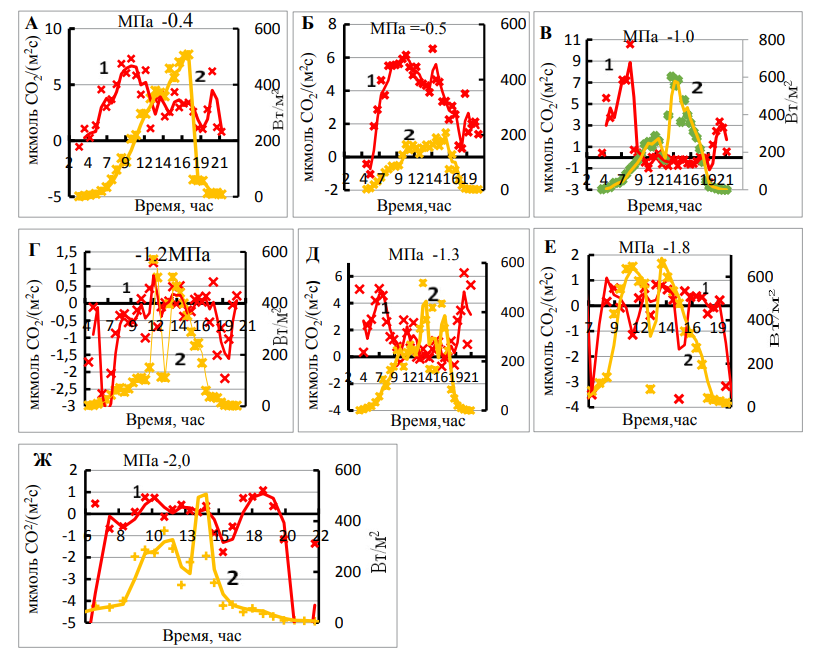 Суточный ход интенсивности фотосинтеза дуба различается на открытом месте в дни с переменной облачностью и в дни со сплошной облачностью при различной степени водообеспеченности (Молчанов, Беляева, 2024). Дневных величин фотосинтеза дуба не наблюдается, интенсивность фотосинтеза следует изменениям солнечной радиации (рис. 2). Но уже с дальнейшим увеличением недостатка водообеспечения при ПВПЛ –1.0 в малооблачный день интенсивность фотосинтеза снижается в три раза, а при сплошной облачности – в два раза. Дальнейшее увеличение недостатка водообеспечения до –1.5 ÷ –1.8 МПа приводит к снижению фотосинтеза до минимальных значений, однако еще большее увеличение недостатка влаги: и –2.5, и –3.5, и даже –4 МПа – не приводит в дневное время к отрицательным значениям интенсивности фотосинтеза.