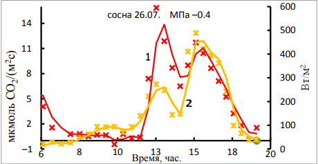 Интенсивность фотосинтеза ели (рис. 3) в течение дня при относительно достаточном водообеспечении (ПВПЛ = –0.4 МПа) в малооблачный день, когда солнечная радиация становится выше 200 Вт м–2, имеет классический двугорбый ход фотосинтеза с провалом в полуденные часы. В день со сплошной облачностью полуденного провала не наблюдается, но несмотря на то, что интенсивность солнечной радиации ниже 200 Вт м–2, фотосинтез постепенно снижается. При снижении ПВПЛ до –0.8 ÷ –1.0 МПа и переменной облачности интенсивность фотосинтеза в полуденные часы снижается практически до нуля. В утренние и вечерние часы интенсивность фотосинтеза ниже, чем в дни с оптимальным водообеспечением.