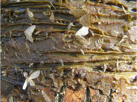 Рис. 2. Бабочки зимней пяденицы, прилипшие к клеевому кольцу: самцы – с крыльями, самки – с рудиментарными крылышками.