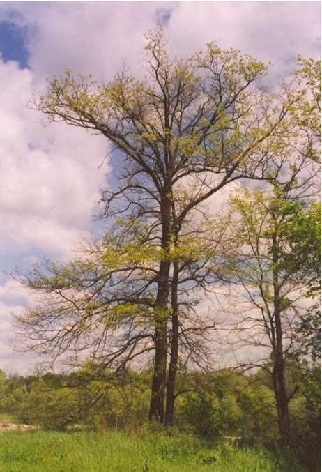 Рис. 3. Дерево дуба с дефолиацией кроны 90% в пойменной ландышево-ежевичной дубраве в мае 2002 г.