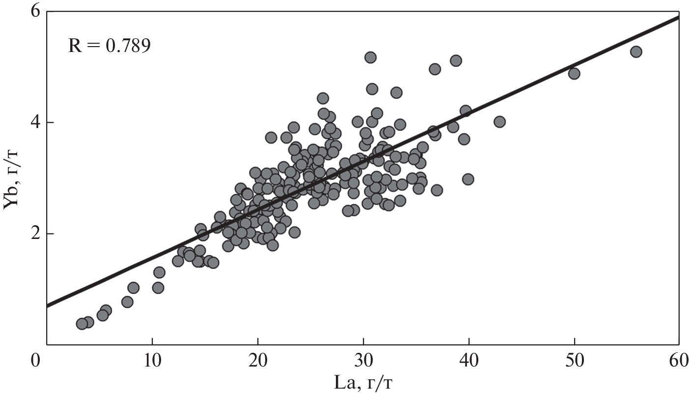 For the rocks of the Upper Jurassic-Lower Cretaceous Bazhenov formation, a significant positive linear dependence of the Th, Hf, Sc, La content on the Al2O3 content was revealed, and their terrigenous genesis was confirmed. It has been determined that the samples in which the distribution of the values of the Sc/Al2O3 and La/Al2O3 ratios does not satisfy the linear dependence are mixed clayey-siliceous rocks with a P2O5 content >1 mas. % or substantially pyritized (in which the content of pyrite exceeds the content of S and C/S ≤ 1), as well as siliceous mudstones with a SiO2 content >70 mas. % by weight. It is concluded that before analyzing geochemical indicators for reconstructing the conditions of formation of the Bazhenov formation, in addition to carbonated rocks, rocks of the above types, as well as rocks that have undergone late diagenetic kaolinization, should be excluded from the analysis. The conditions of formation of the studied deposits were reconstructed based on the analysis of the values of a number of geochemical modules and indicators. As a result of the study of CIA, CIW variations, it was confirmed that the climate in the Late Jurassic-Early Cretaceous period in the West Siberian sedimentary basin was warm, semiarid. It was revealed that during the entire period under review, it did not change significantly. For the deposits of the Bazhenov formation, a number of indicators such as (La/Yb)N, Eu/Eu*, as well as the distribution of trace element content values on the triangular diagram Th‒La‒Sc, suggest that in the central and southeastern regions of the formation distribution area, the sources of demolition of the mafic composition prevailed.