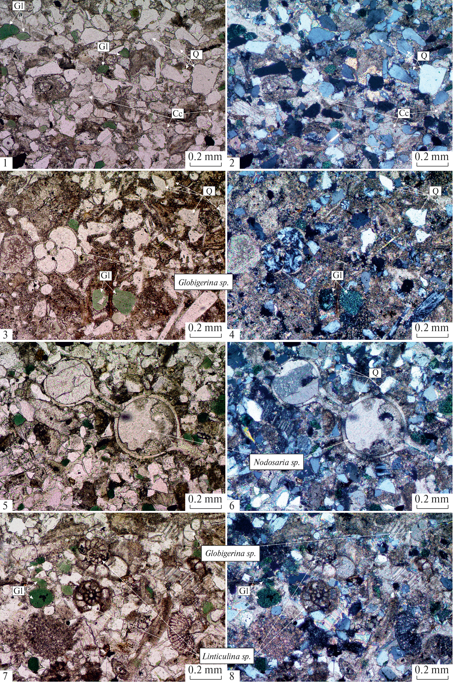 Песчаники светло-пепельно-серые массивного облика мелко-среднезернистые, на выветрелой поверхности приобретают охристый оттенок. При микроскопическом изучении песчаников установлено, что для них характерна обломочная псаммитовая структура. Размер обломков 0.05–2 мм в поперечнике, сортировка плохая или отсутствует. Обломки преимущественно остроугольные, представлены в основном кварцем, редко – полевыми шпатами и детритными чешуйками белой слюды. В заметном количестве присутствуют зерна глауконита, биокласты (фрагменты карбонатных раковин, мшанкок, кораллов, а также иглоподобные образования карбонатного и кремнистого состава) и целые раковины фораминифер, принадлежащих родам Lenticulina, Nodosaria, Globigerina (рис. 5). Обломочная часть породы (терригенные обломки, глауконит, биокласты и раковины фораминифер) в сумме составляет 50–60%, а цемент – 40–50% объема породы. Цемент известковый сплошной очень неравномерно распределенный базальный и поровый тонко-микрокристаллический, реже среднекристаллический и даже крупнокристаллический. В последнем случае цемент пойкилитовый.